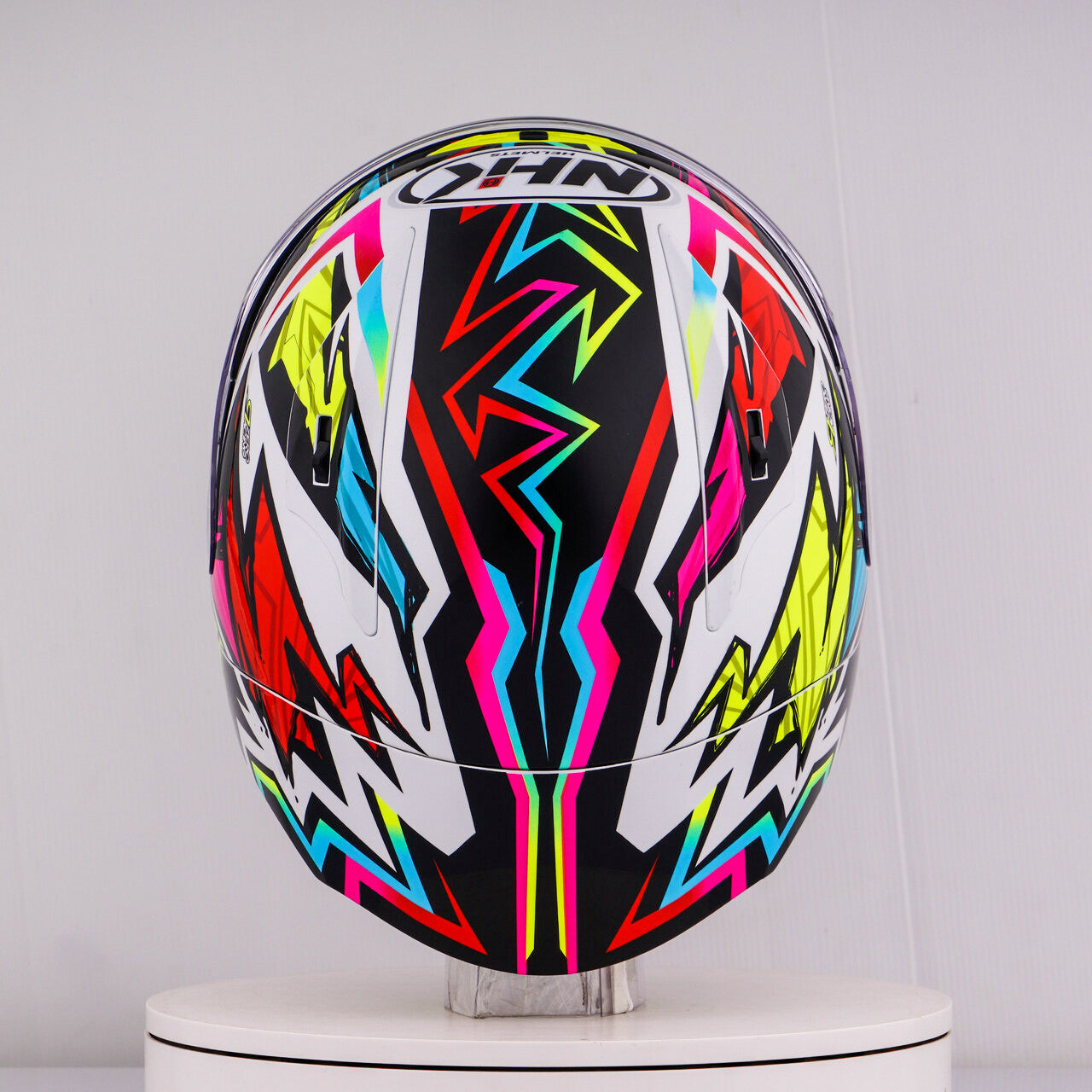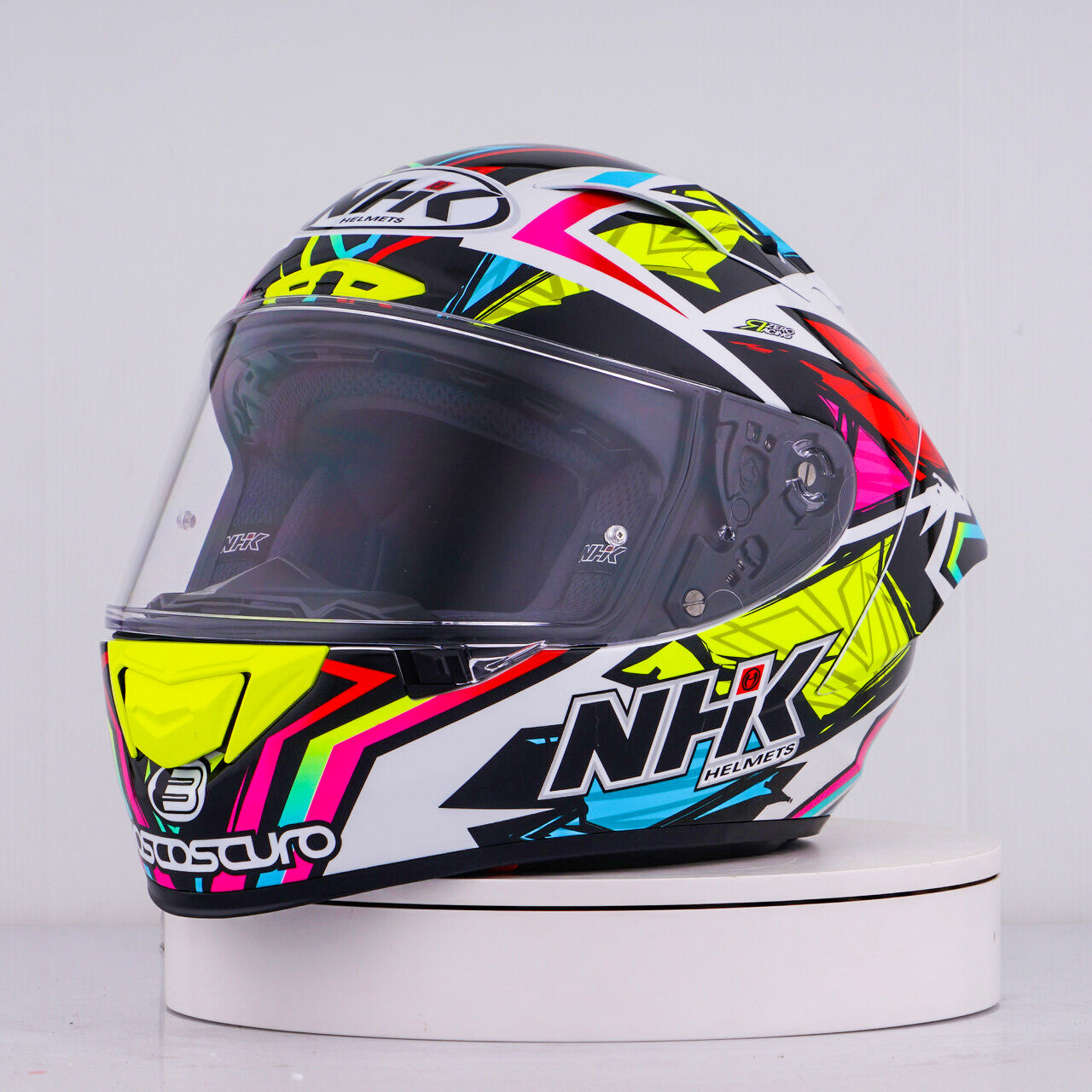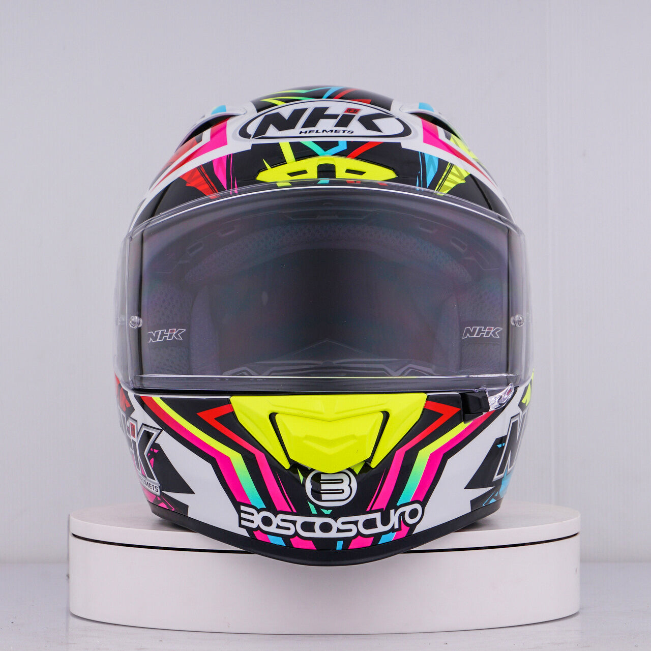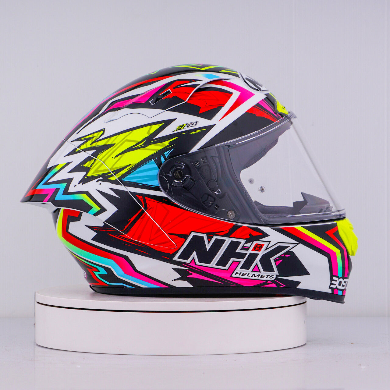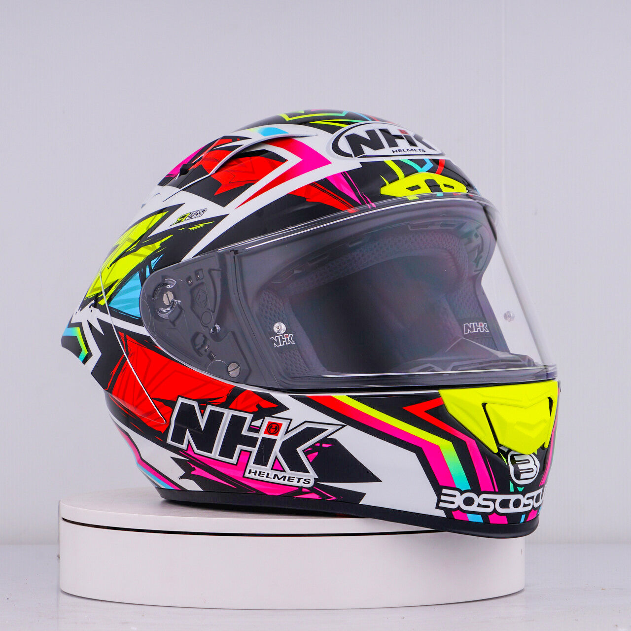 Erleben Sie den ultimativen Motorradhelm mit dem NHK GP-R Tech Race, der FIM-zugelassen ist und eine (AFRC) Advanced Fiberglass Reinforced Composite-Verbundschale in fünf Größen bietet, die perfekte Passform und Schutz garantiert. Der AFRC ist ein Verbundwerkstoff, der aus einer Matrix und Verstärkungsfasern besteht. Die Matrix ist in der Regel ein Polymer (z. B. Epoxidharz), während die Verstärkungsfasern aus Glasfasern bestehen. Mit neun Innenschalengrößen und zwölf Helmgrößen finden Sie immer die ideale Passform. Unser 4D-Air Lüftungssystem sorgt für eine optimale Belüftung und ein angenehmes Tragegefühl, während das Premium und komfortable Innenfutter höchsten Komfort bietet.Der Helm wurde aerodynamisch in den Klassen der MotoGP getestet und verfügt über ein flaches Visier mit "Wide Angle View" für ein erweitertes Sichtfeld. Das Pin-Lock & Tear-off-ready Visier gewährleistet klare Sicht unter allen Bedingungen. Dank des 100% vollmechanischen Visiersystems ist der Wechsel des Visiers einfach und schnell.Das herausnehmbare und waschbare Innenfutter sorgt für einfache Pflege und Hygiene. Der Helm ist zudem vorbereitet für einen "Camel-Bag" und kann problemlos mit Brille getragen werden. Das Doppel-D-Ring-Rückhaltesystem und die Wange zur Notabnahme bieten zusätzliche Sicherheit und Stabilität. Der Helm wurde im Windkanal getestet, um beste Leistung bei hoher Geschwindigkeit zu gewährleisten.