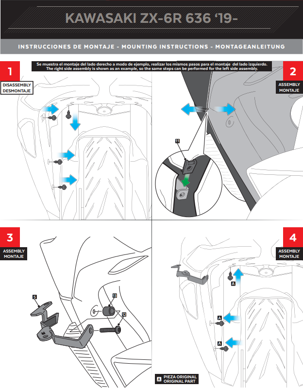 Verbessern Sie die Aerodynamik, Stabilität und Performance Ihrer Kawasaki ZX-6R 636 (2018-2023) mit den Puig Downforce Sport Spoilern, Modell 3176. Diese fortschrittlichen Winglets wurden auf Basis der Tests und Ergebnisse des Kawasaki Racing Teams in der WorldSBK entwickelt und optimieren das Fahrverhalten auf der Rennstrecke – ideal für ambitionierte Fahrer.