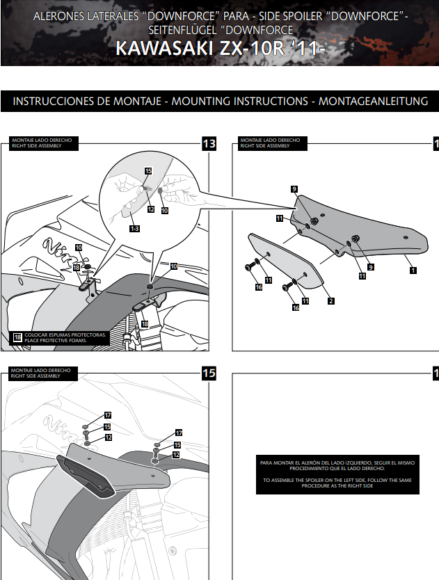 Profitieren Sie von der aerodynamischen Rennsport-Technologie mit den Puig Downforce Sport Spoilern, Modell 9882, speziell entwickelt für die Kawasaki ZX-10 R/RR (2011-2020). Diese Winglets basieren auf den Tests und Erkenntnissen des Kawasaki Racing Teams in der WorldSBK und sorgen für mehr Stabilität, kontrolliertes Fahrverhalten und eine optimale Performance – perfekt für den Einsatz auf der Rennstrecke.