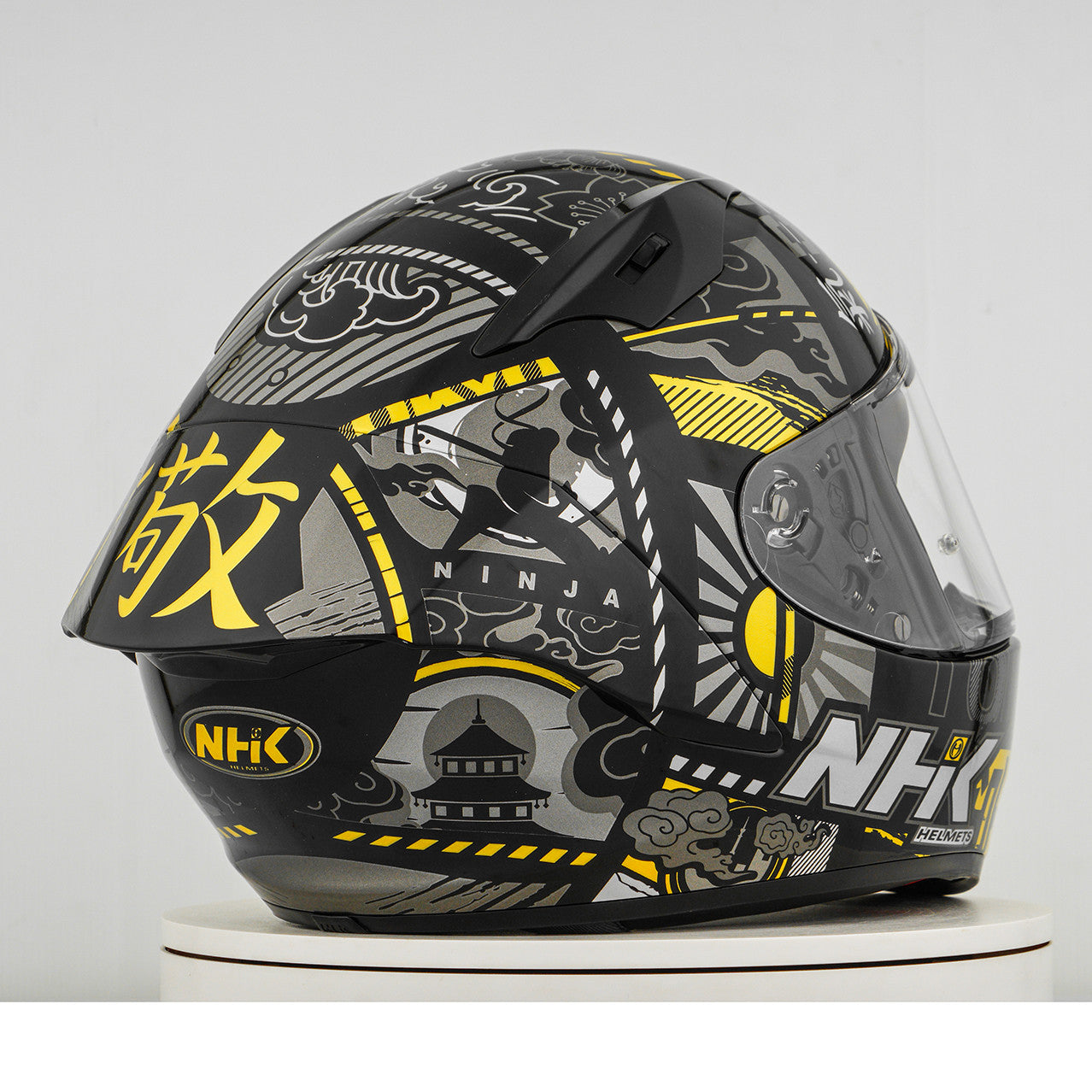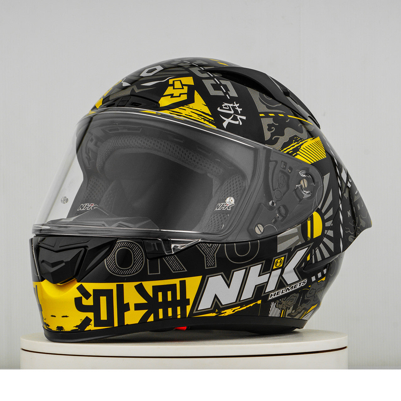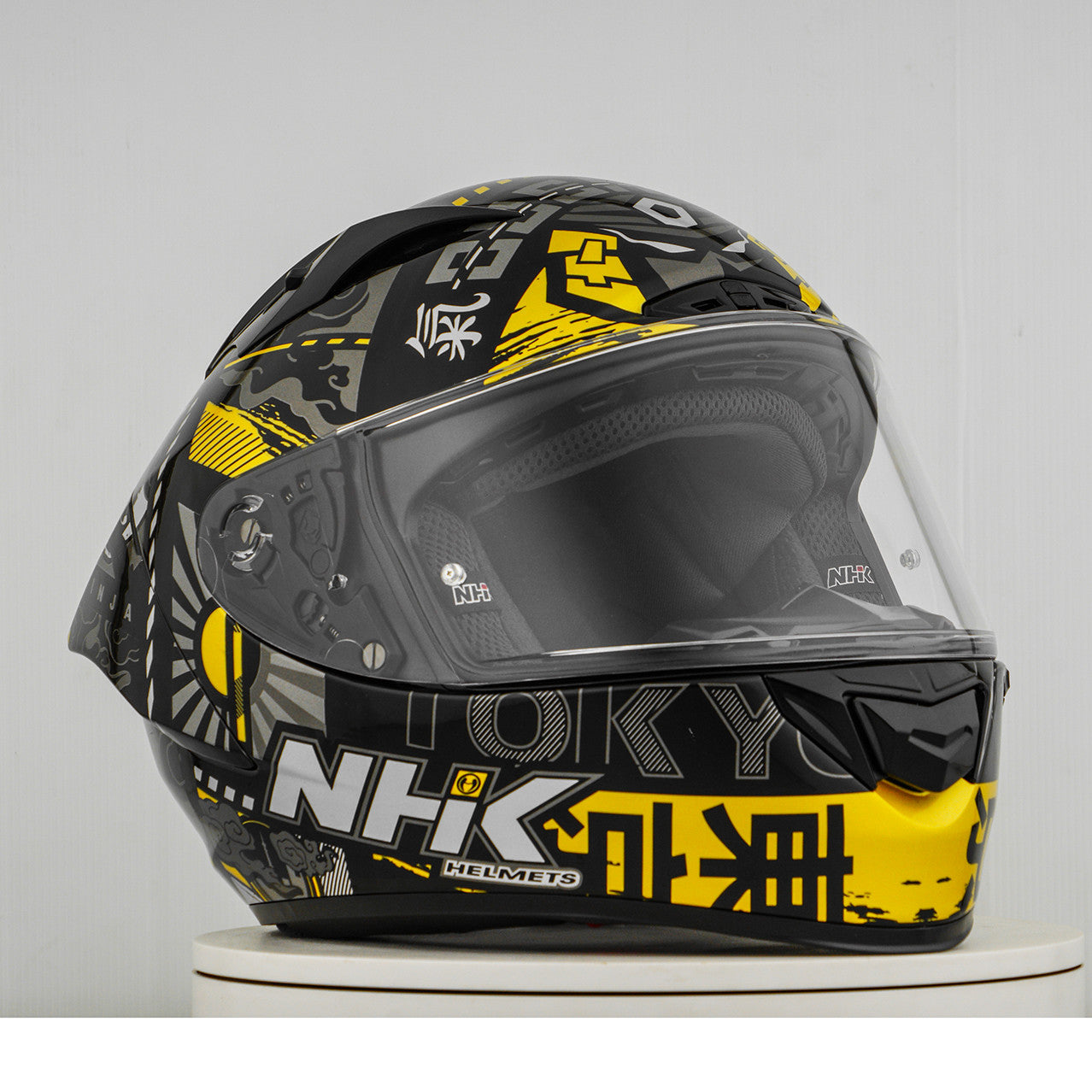 Experience the ultimate motorcycle helmet with the NHK GP-R Tech Race, which is FIM and an (AFRC) Advanced Fiberglass Reinforced Composite composite in five sizes that guarantees perfect fit and protection. The AFRC is a composite material that consists of a matrix and reinforcement fibers. The matrix is usually a polymer (e.g. epoxy resin), while the reinforcement fibers are made of glass fibers. With nine inner shell sizes and twelve helmet sizes, you will always find the ideal fit. Our 4D-air ventilation system ensures optimal ventilation and a comfortable fit, while the premium and comfortable inner lining offers maximum comfort. The helmet was aerodynamically tested in the MotoGP classes and has a flat visor with "Wide Angle View" for an extended field of vision. The PIN-Lock & Tear-Off-Ready Visor ensures clear view from all conditions. Thanks to the 100% full mechanical visor system, changing the visor is easy and quick. The removable and washable inner lining ensures easy care and hygiene. The helmet is also prepared for a "camel bag" and can easily be carried with glasses. The double D ring retention system and the cheek for acceptance offer additional security and stability. The helmet was tested in the wind tunnel to ensure the best performance at high speed.