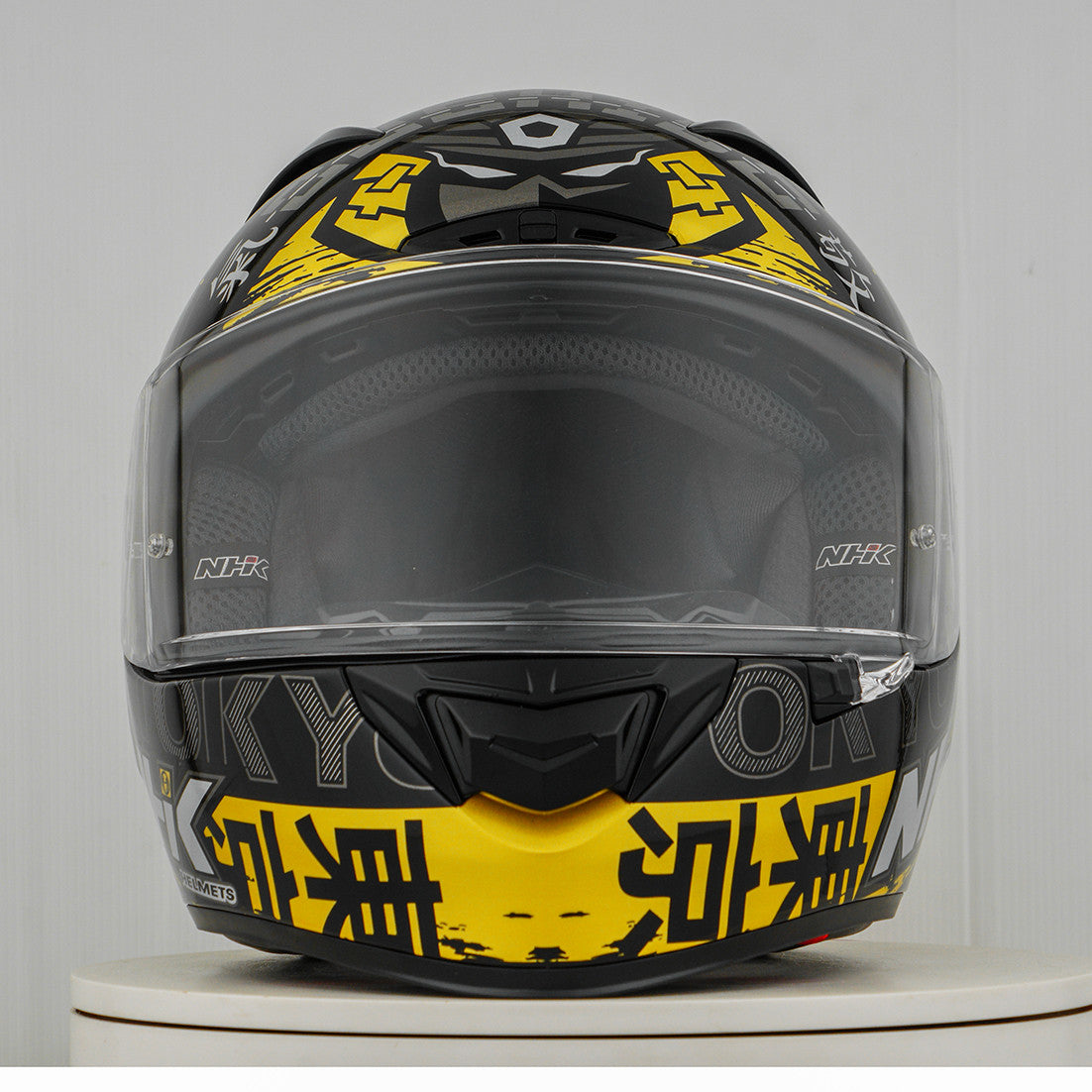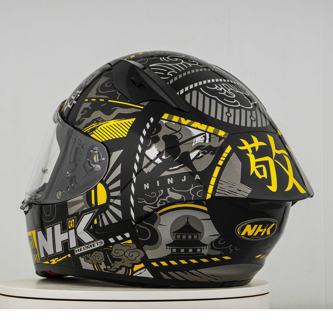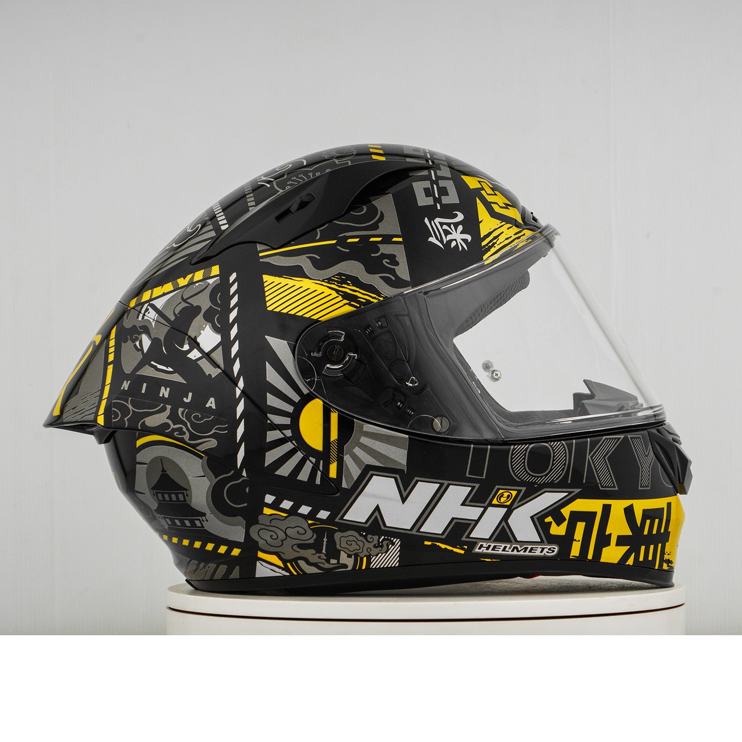 Experience the ultimate motorcycle helmet with the NHK GP-R Tech Race, which is FIM and an (AFRC) Advanced Fiberglass Reinforced Composite composite in five sizes that guarantees perfect fit and protection. The AFRC is a composite material that consists of a matrix and reinforcement fibers. The matrix is usually a polymer (e.g. epoxy resin), while the reinforcement fibers are made of glass fibers. With nine inner shell sizes and twelve helmet sizes, you will always find the ideal fit. Our 4D-air ventilation system ensures optimal ventilation and a comfortable fit, while the premium and comfortable inner lining offers maximum comfort. The helmet was aerodynamically tested in the MotoGP classes and has a flat visor with "Wide Angle View" for an extended field of vision. The PIN-Lock & Tear-Off-Ready Visor ensures clear view from all conditions. Thanks to the 100% full mechanical visor system, changing the visor is easy and quick. The removable and washable inner lining ensures easy care and hygiene. The helmet is also prepared for a "camel bag" and can easily be carried with glasses. The double D ring retention system and the cheek for acceptance offer additional security and stability. The helmet was tested in the wind tunnel to ensure the best performance at high speed.