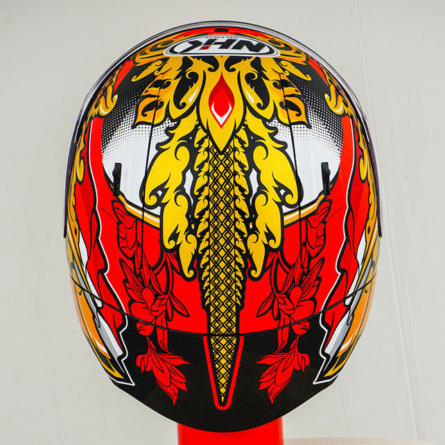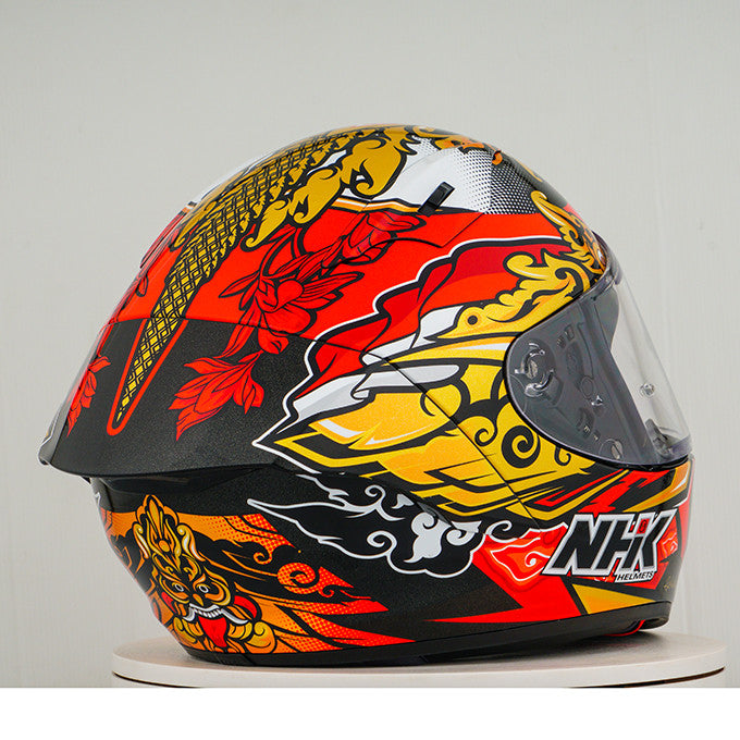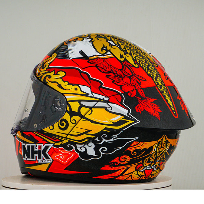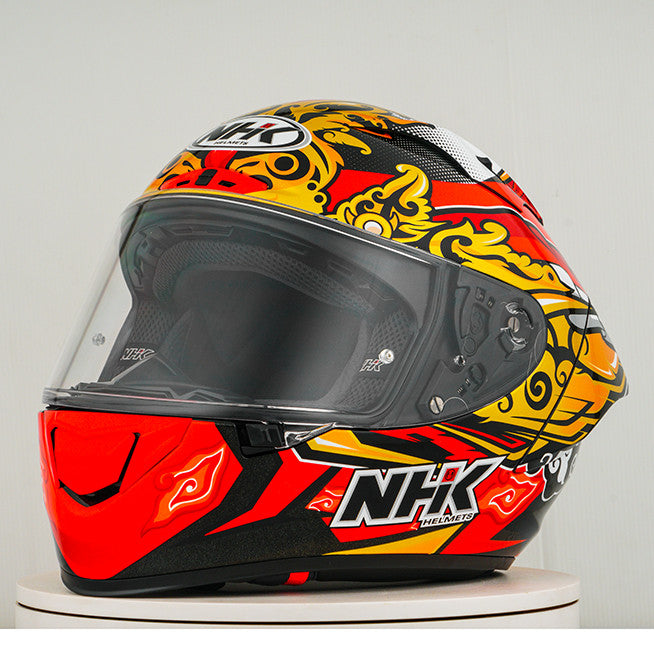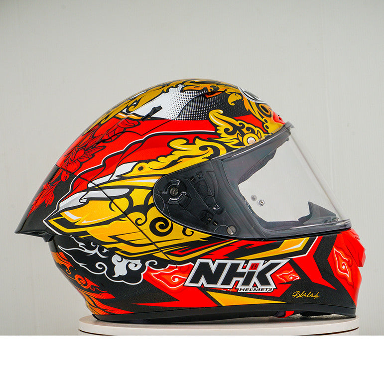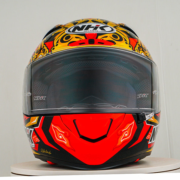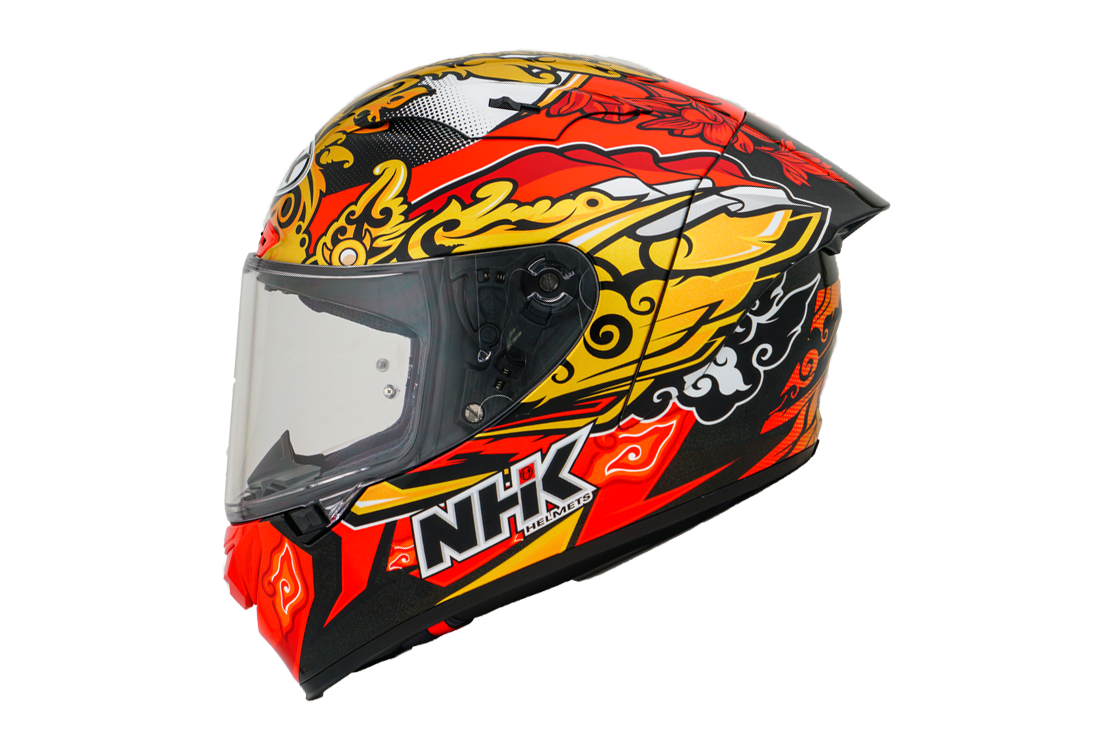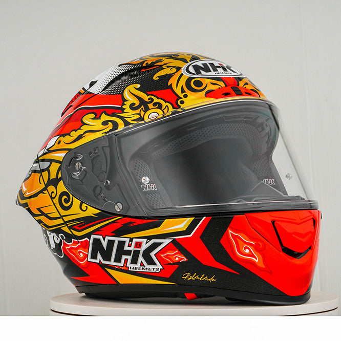 Experience the ultimate motorcycle helmet with the NHK GP-R Tech Race, which is FIM and an (AFRC) Advanced Fiberglass Reinforced Composite composite shell in five sizes that guarantees perfect fit and protection. The AFRC is a composite material that consists of a matrix and reinforcement fibers. The matrix is usually a polymer (e.g. epoxy resin), while the reinforcement fibers are made of glass fibers. With nine inner shell sizes and twelve helmet sizes, you will always find the ideal fit. Our 4D-air ventilation system ensures optimal ventilation and a comfortable fit, while the premium and comfortable inner lining offers maximum comfort. The helmet was aerodynamically tested in the MotoGP classes and has a flat visor with "Wide Angle View" for an extended field of vision. The PIN-Lock & Tear-Off-Ready Visor ensures clear view from all conditions. Thanks to the 100% full mechanical visor system, changing the visor is easy and quick. The removable and washable inner lining ensures easy care and hygiene. The helmet is also prepared for a "camel bag" and can easily be carried with glasses. The double D ring retention system and the cheek for acceptance offer additional security and stability. The helmet was tested in the wind tunnel to ensure the best performance at high speed.