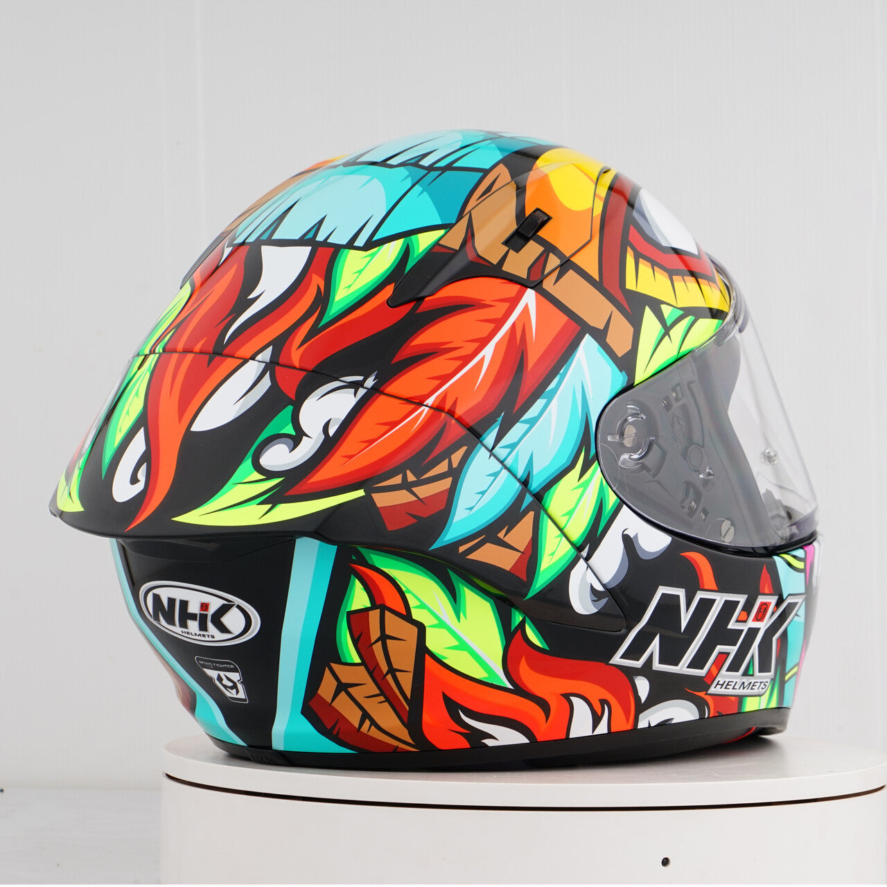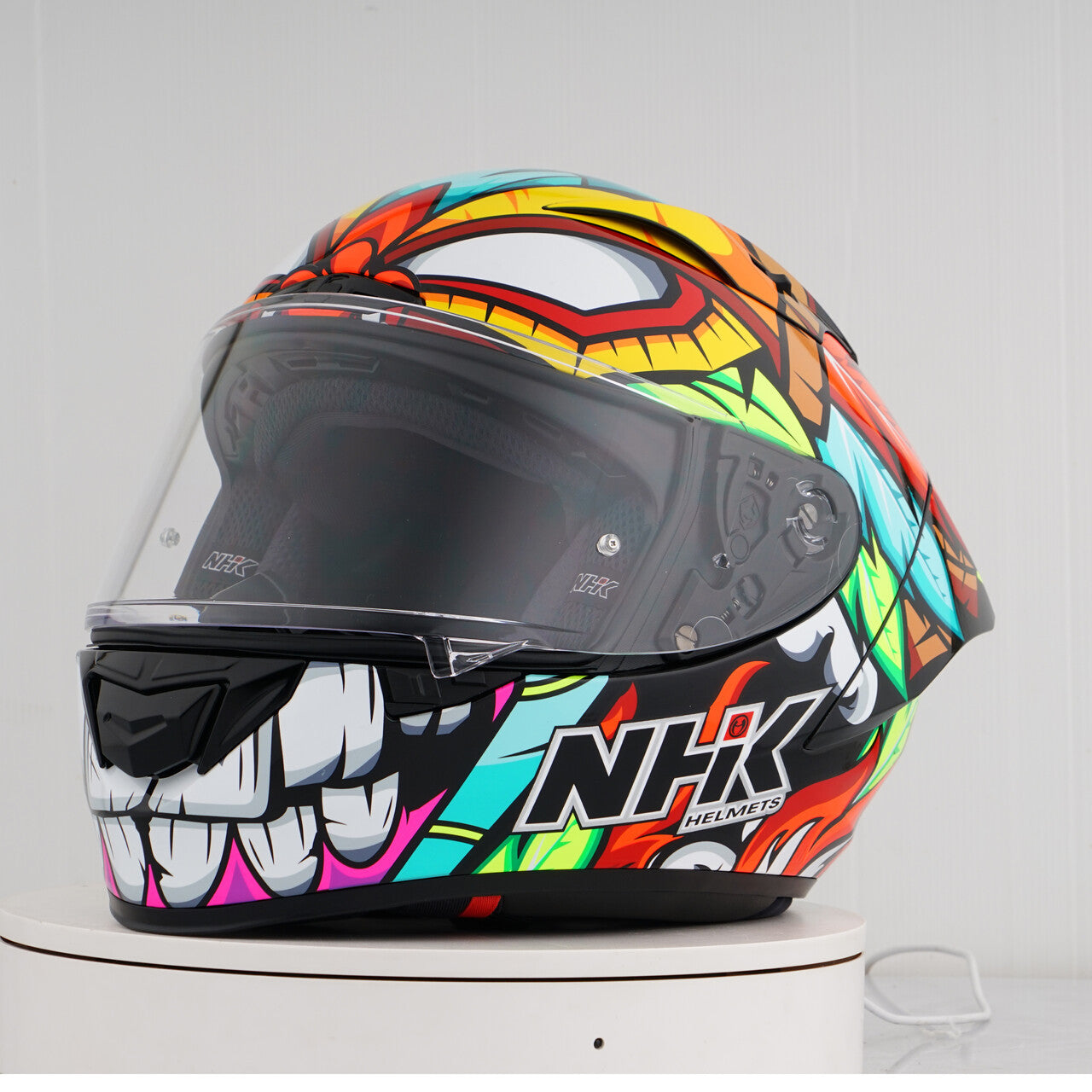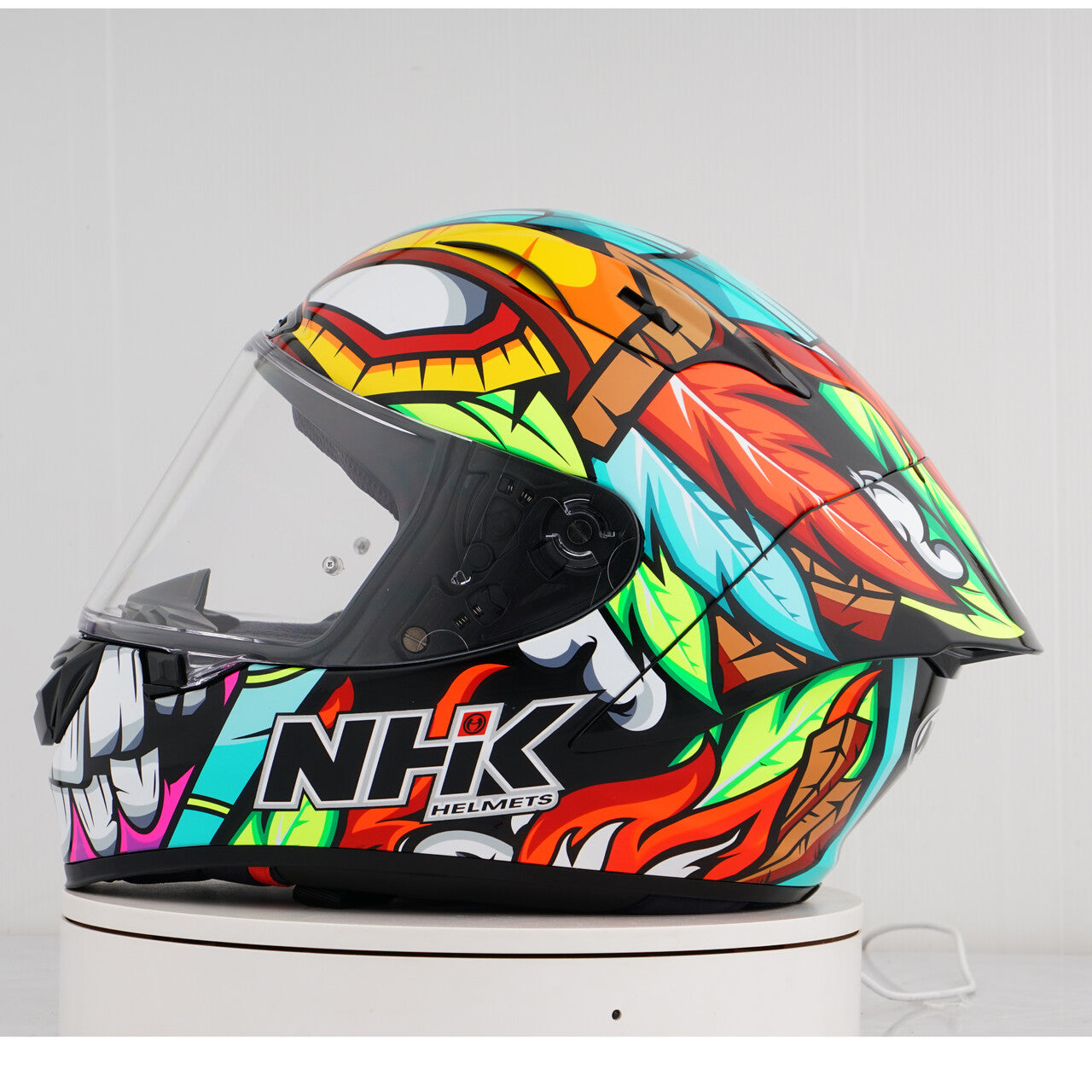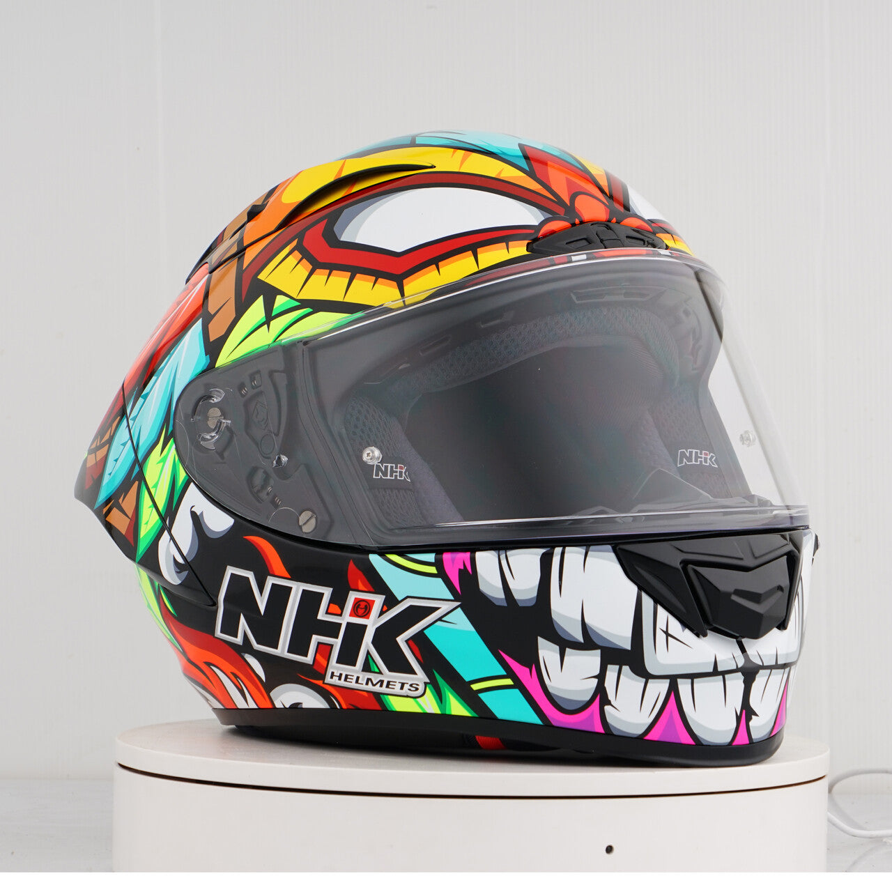 Experience the ultimate motorcycle helmet with the NHK GP-R Tech Race, which is FIM and an (AFRC) Advanced Fiberglass Reinforced Composite composite shell in five sizes that guarantees perfect fit and protection. The AFRC is a composite material that consists of a matrix and reinforcement fibers. The matrix is ​​usually a polymer (e.g. epoxy resin), while the reinforcement fibers are made of glass fibers. With nine inner shell sizes and twelve helmet sizes, you will always find the ideal fit. Our 4D-air ventilation system ensures optimal ventilation and a comfortable fit, while the premium and comfortable inner lining offers maximum comfort. The helmet was aerodynamically tested in the MotoGP classes and has a flat visor with "Wide Angle View" for an extended field of vision. The PIN-Lock & Tear-Off-Ready Visor ensures clear view from all conditions. Thanks to the 100% full mechanical visor system, changing the visor is easy and quick. The removable and washable inner lining ensures easy care and hygiene. The helmet is also prepared for a "camel bag" and can easily be carried with glasses. The double D ring retention system and the cheek for acceptance offer additional security and stability. The helmet was tested in the wind tunnel to ensure the best performance at high speed.