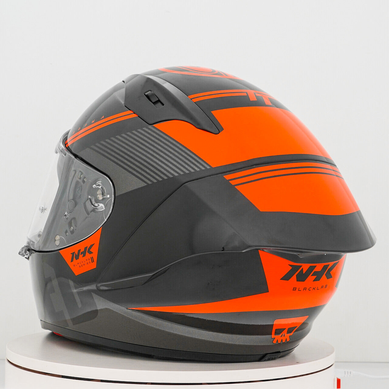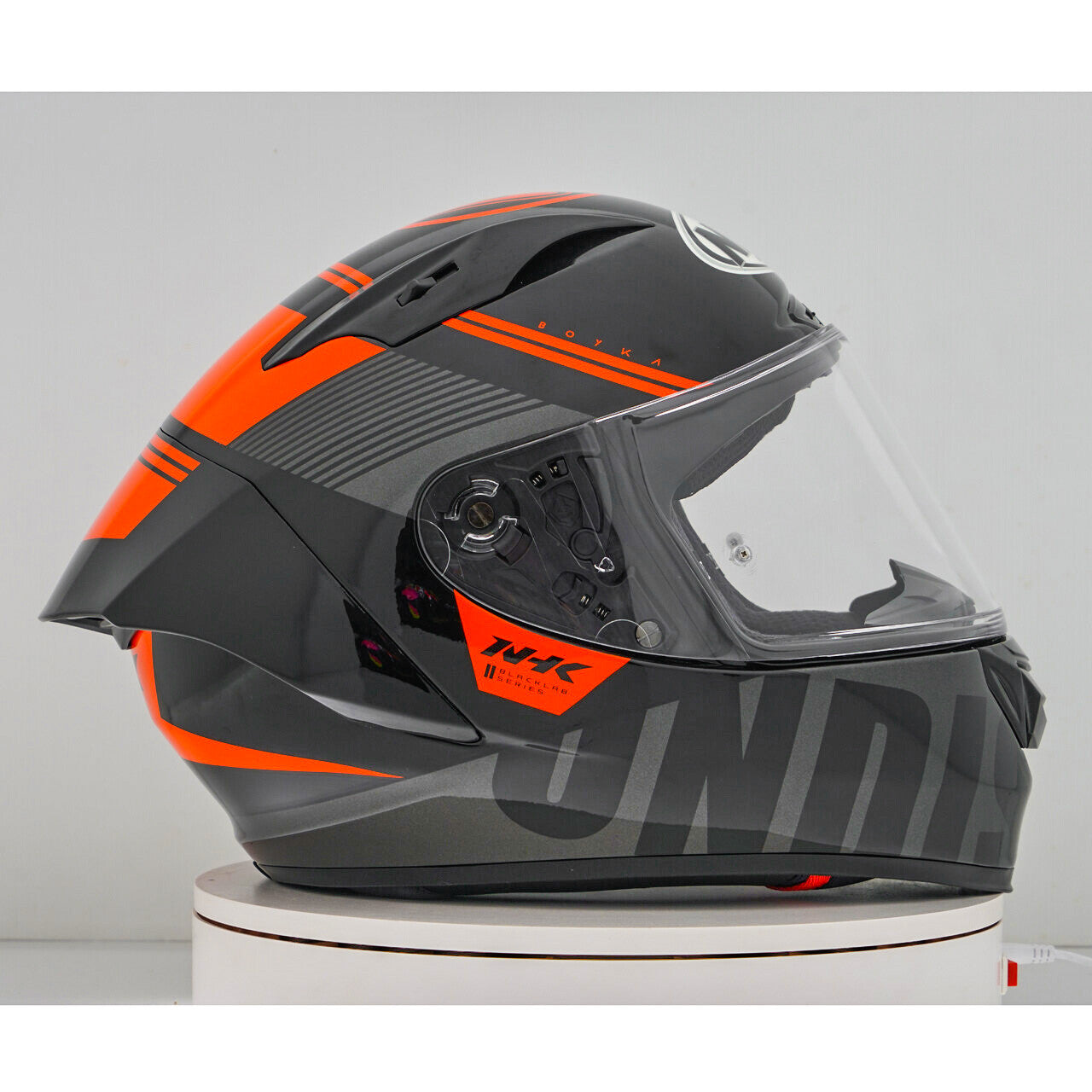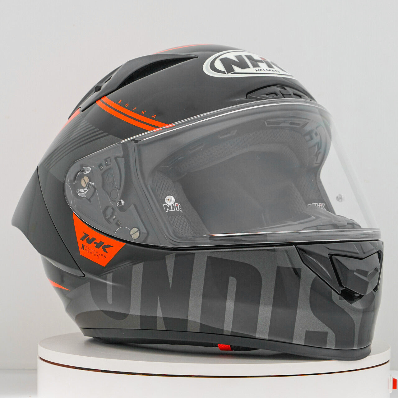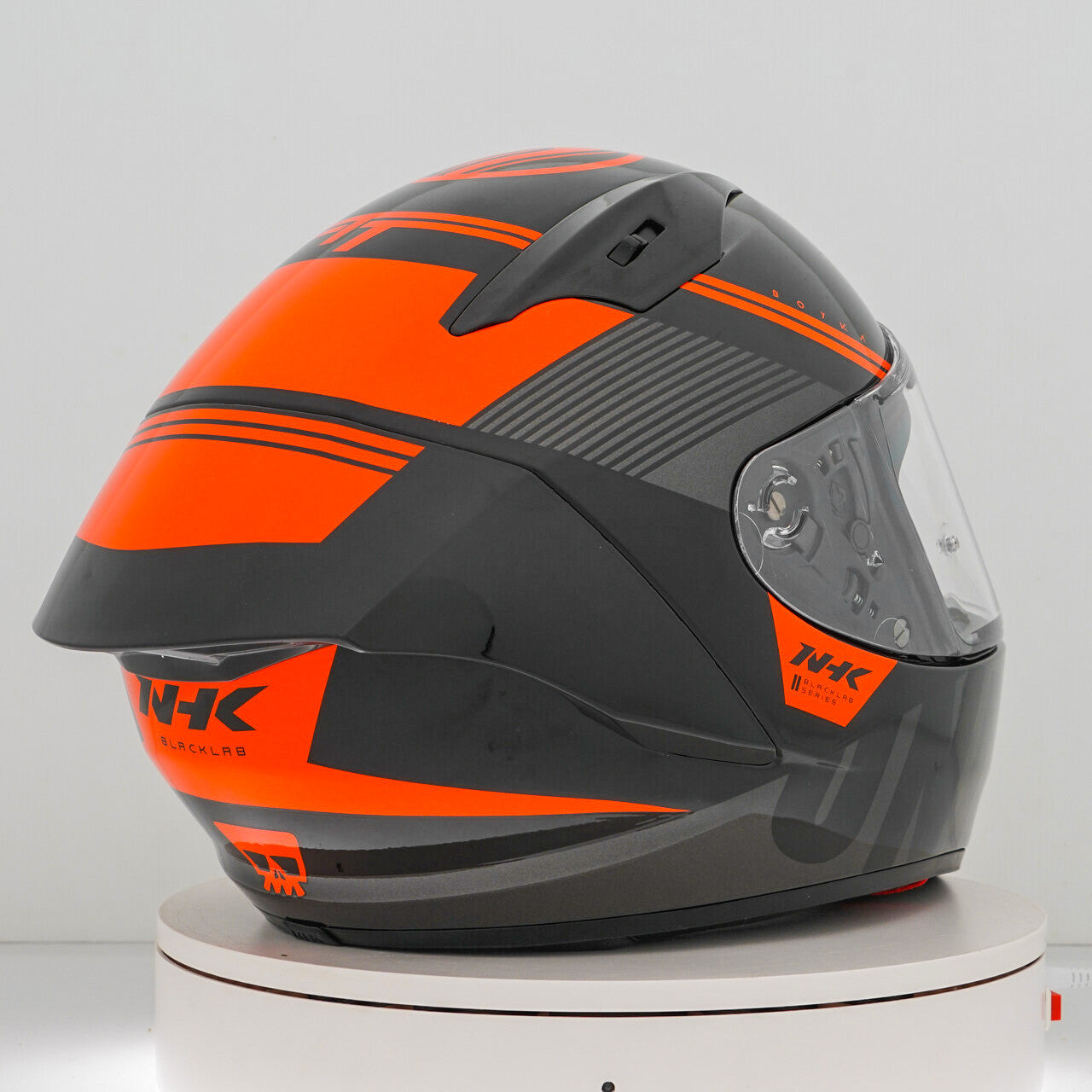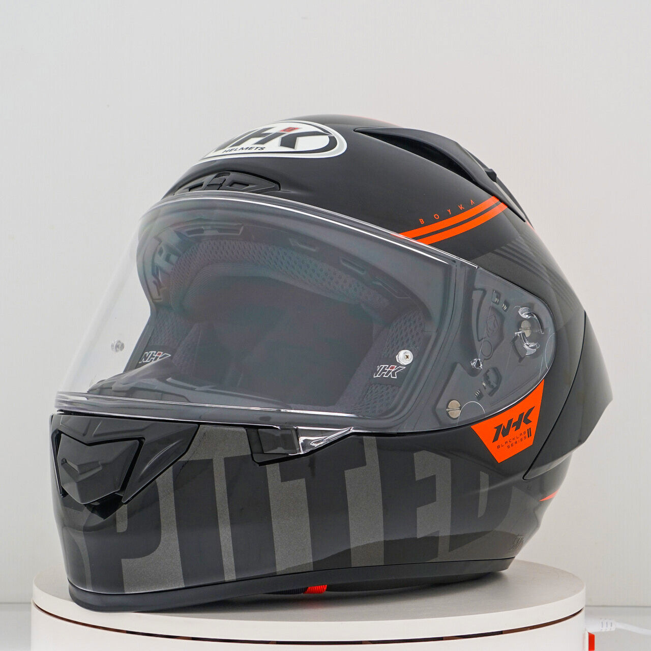 Experience the ultimate motorcycle helmet with the NHK GP-R Tech Race, which is FIM and an (AFRC) Advanced Fiberglass Reinforced Composite composite shell in five sizes that guarantees perfect fit and protection. The AFRC is a composite material that consists of a matrix and reinforcement fibers. The matrix is usually a polymer (e.g. epoxy resin), while the reinforcement fibers are made of glass fibers. With nine inner shell sizes and twelve helmet sizes, you will always find the ideal fit. Our 4D-air ventilation system ensures optimal ventilation and a comfortable fit, while the premium and comfortable inner lining offers maximum comfort. The helmet was aerodynamically tested in the MotoGP classes and has a flat visor with "Wide Angle View" for an extended field of vision. The PIN-Lock & Tear-Off-Ready Visor ensures clear view from all conditions. Thanks to the 100% full mechanical visor system, changing the visor is easy and quick. The removable and washable inner lining ensures easy care and hygiene. The helmet is also prepared for a "camel bag" and can easily be carried with glasses. The double D ring retention system and the cheek for acceptance offer additional security and stability. The helmet was tested in the wind tunnel to ensure the best performance at high speed.