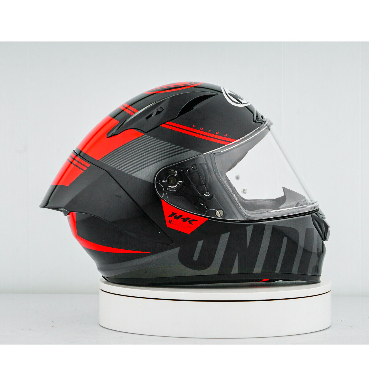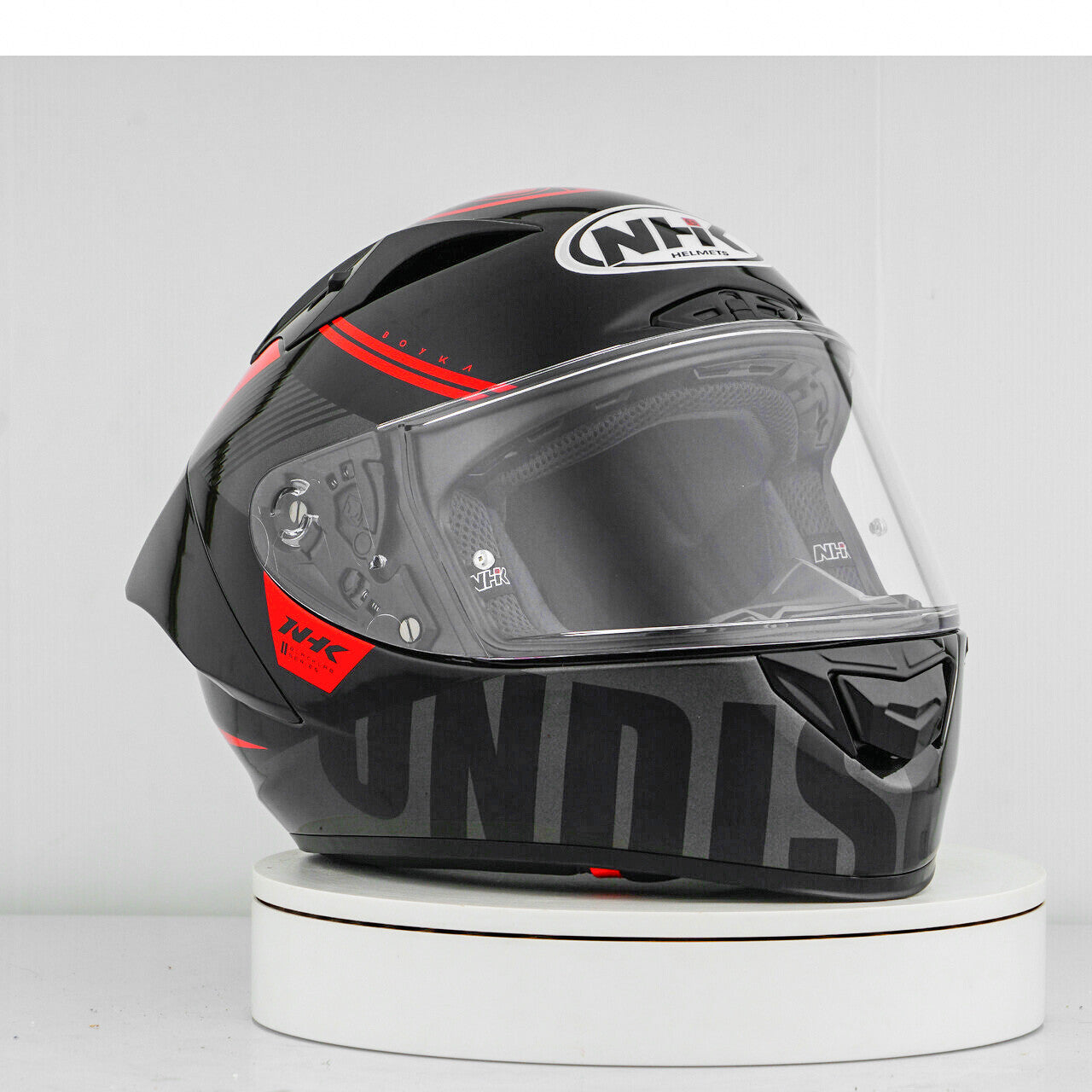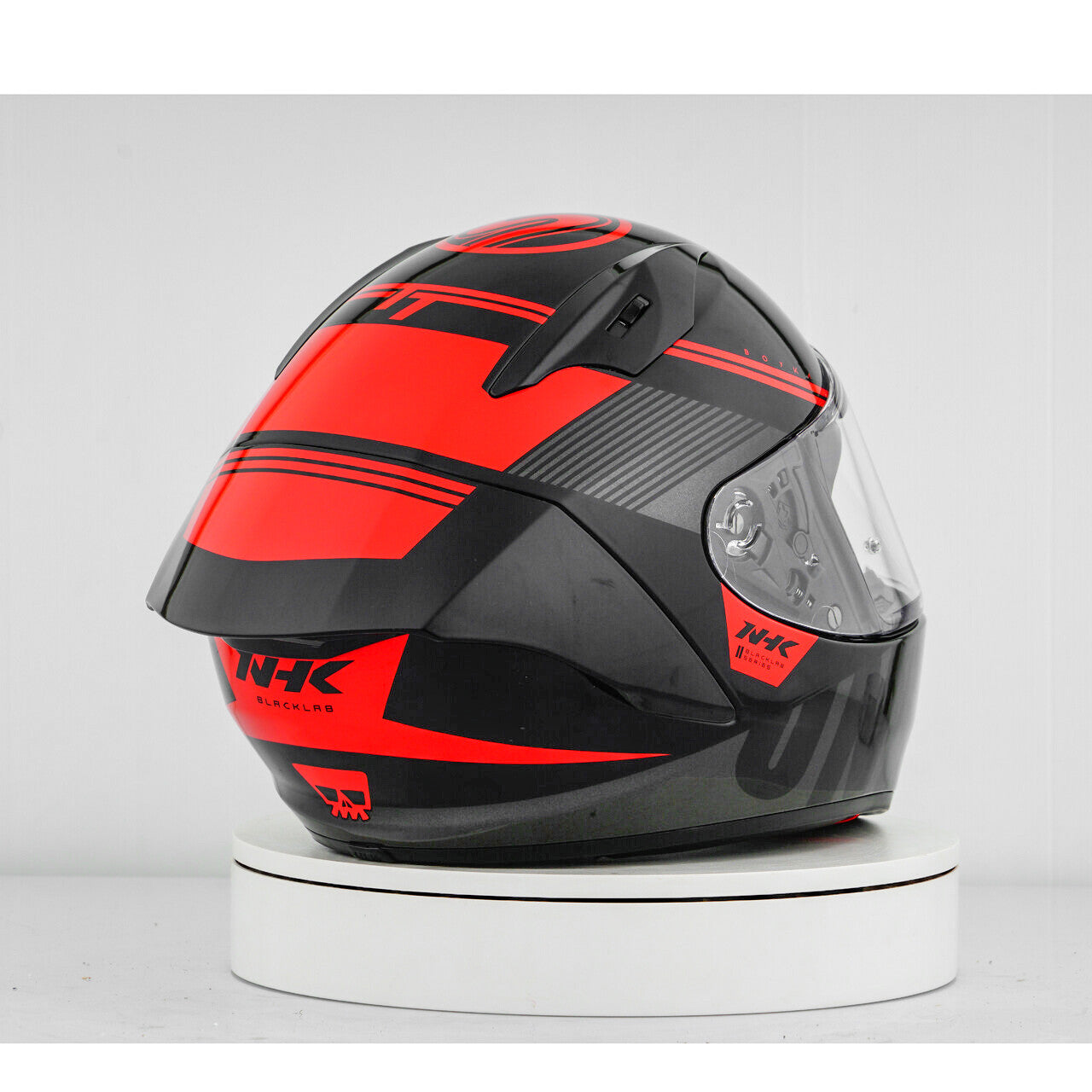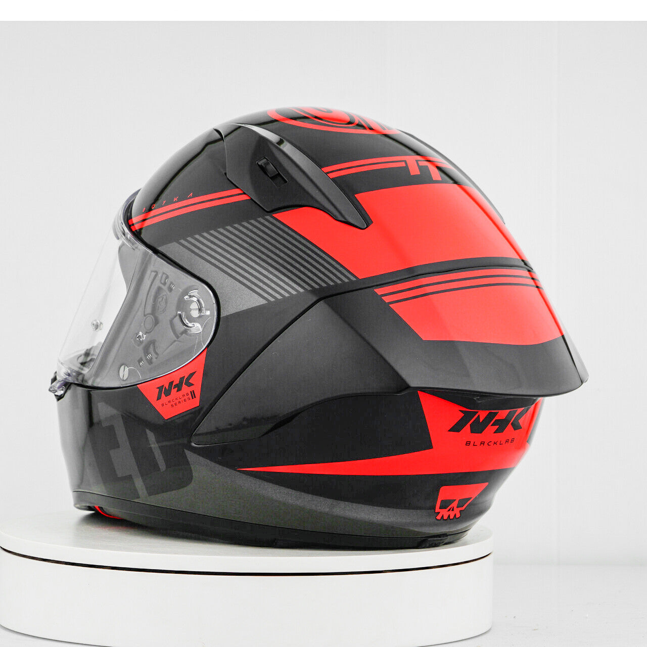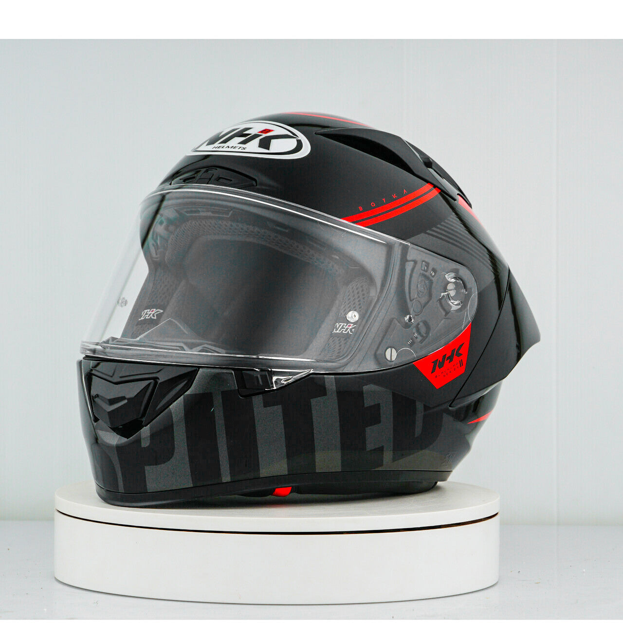 Experience the ultimate motorcycle helmet with the NHK GP-R Tech Race, which is FIM and an (AFRC) Advanced Fiberglass Reinforced Composite composite shell in five sizes that guarantees perfect fit and protection. The AFRC is a composite material that consists of a matrix and reinforcement fibers. The matrix is usually a polymer (e.g. epoxy resin), while the reinforcement fibers are made of glass fibers. With nine inner shell sizes and twelve helmet sizes, you will always find the ideal fit. Our 4D-Air ventilation system ensures optimal ventilation and a comfortable fit, while the premium and comfortable inner lining offers maximum comfort. The helmet was aerodynamically tested in the classes of the MotoGP and has a flat visor with "wide angle view" for an extended field of vision. The PIN-Lock & Tear-Off-Ready Visor ensures clear view from all conditions. Thanks to the 100% full mechanical visor system, changing the visor is easy and quick. The removable and washable inner lining ensures easy care and hygiene. The helmet is also prepared for a "camel bag" and can easily be carried with glasses. The double D ring retention system and the cheek for acceptance offer additional security and stability. The helmet was tested in the wind tunnel to ensure the best performance at high speed.