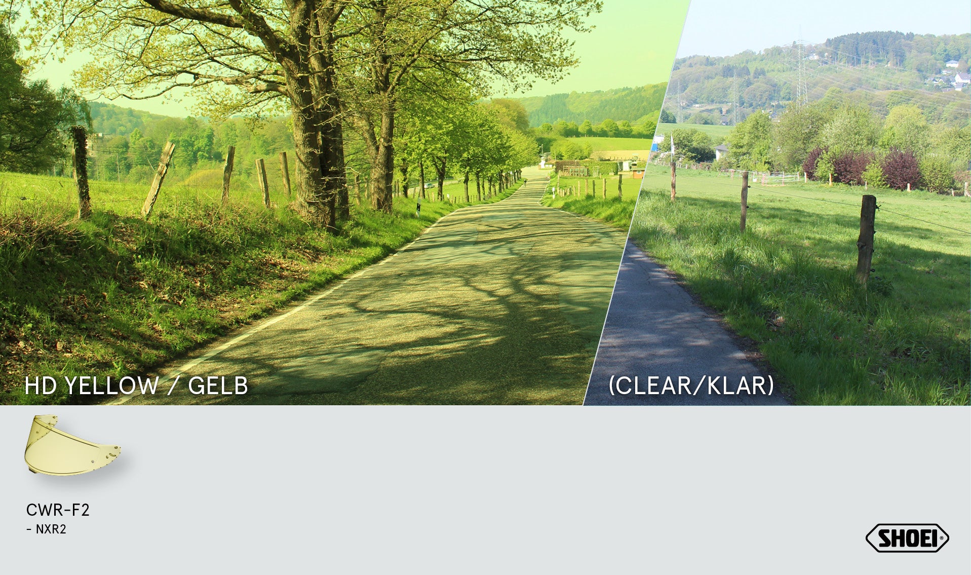 The high definition yellow visor (CWR-F2PN) from Shoei was specially developed for improved contrasts and higher viewing in poor lighting conditions. Perfect in fog, cloudy weather or deep sun. The yellowish color increases visual perception and depth of sharpness - ideal for demanding drivers.
