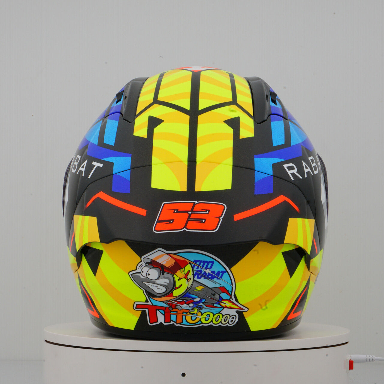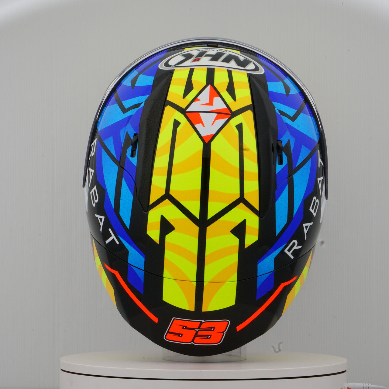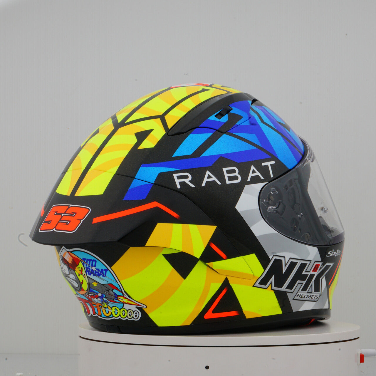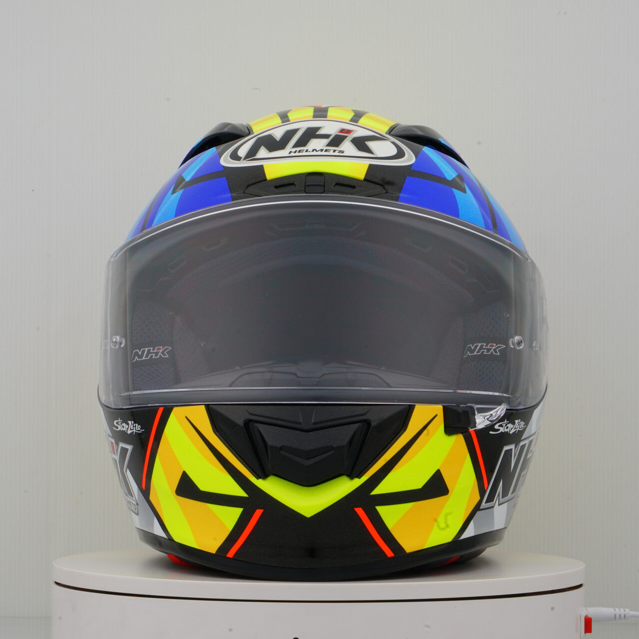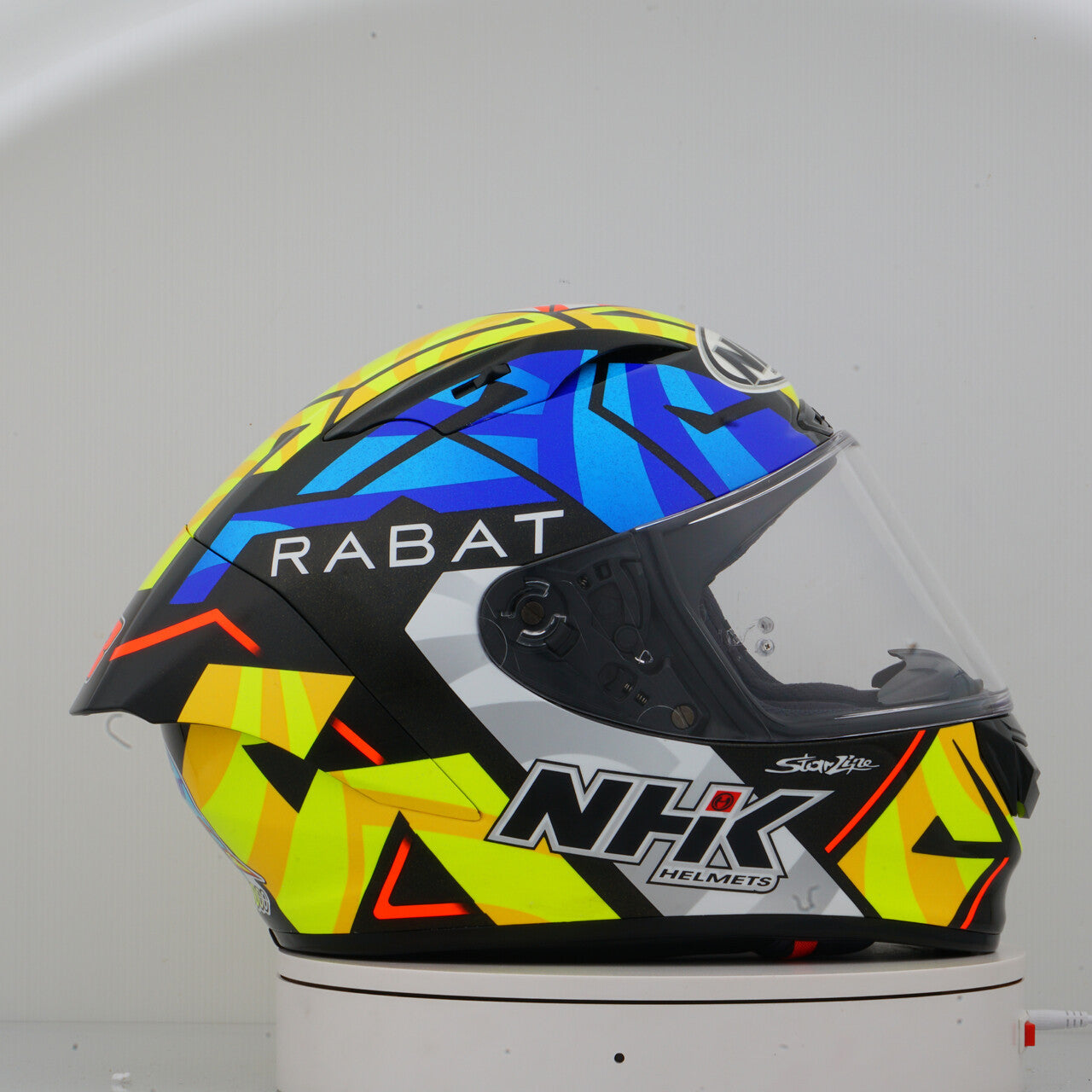 Experimente el mejor casco de motocicleta con la carrera tecnológica NHK GP-R, que es FIM y una carcasa compuesta compuesta de fibra de vidrio avanzada (AFRC) (AFRC) en cinco tamaños que garantizan un ajuste y protección perfectos. El AFRC es un material compuesto que consiste en una matriz y fibras de refuerzo. La matriz suele ser un polímero (por ejemplo, resina epoxi), mientras que las fibras de refuerzo están hechas de fibras de vidrio. Con nueve tamaños de concha interno y doce tamaños de casco, siempre encontrará el ajuste ideal. Nuestro sistema de ventilación 4D-Air garantiza una ventilación óptima y un ajuste cómodo, mientras que el forro interno premium y cómodo ofrece la máxima comodidad. El casco se probó aerodinámicamente en las clases de MotoGP y tiene una visera plana con "vista de gran angular" para un campo de visión extendido. La visera PIN-Lock y la lista de lágrimas garantiza una visión clara de todas las condiciones. Gracias al sistema de visor mecánico 100% completo, cambiar el visor es fácil y rápido. El revestimiento interno extraíble y lavable asegura un cuidado e higiene fácil. El casco también está preparado para una "bolsa de camello" y se puede transportar fácilmente con gafas. El sistema de retención de anillo de doble D y la mejilla para la aceptación ofrecen seguridad y estabilidad adicionales. El casco se probó en el túnel de viento para garantizar el mejor rendimiento a alta velocidad.