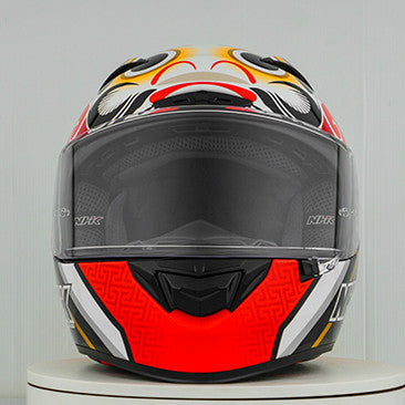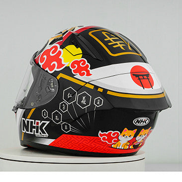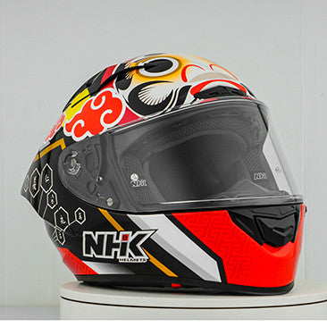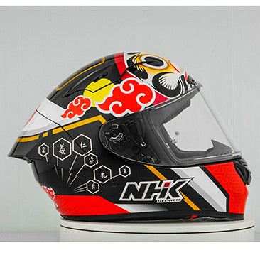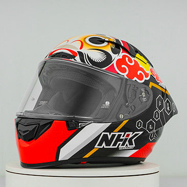 Experimente el mejor casco de motocicleta con la carrera tecnológica NHK GP-R, que es FIM y una carcasa compuesta compuesta de fibra de vidrio avanzada (AFRC) (AFRC) en cinco tamaños que garantizan un ajuste y protección perfectos. El AFRC es un material compuesto que consiste en una matriz y fibras de refuerzo. La matriz suele ser un polímero (por ejemplo, resina epoxi), mientras que las fibras de refuerzo están hechas de fibras de vidrio. Con nueve tamaños de concha interno y doce tamaños de casco, siempre encontrará el ajuste ideal. Nuestro sistema de ventilación 4D-Air garantiza una ventilación óptima y un ajuste cómodo, mientras que el forro interno premium y cómodo ofrece la máxima comodidad. El casco se probó aerodinámicamente en las clases de MotoGP y tiene una visera plana con "vista de gran angular" para un campo de visión extendido. La visera PIN-Lock y la lista de lágrimas garantiza una visión clara de todas las condiciones. Gracias al sistema de visor mecánico 100% completo, cambiar el visor es fácil y rápido. El revestimiento interno extraíble y lavable asegura un cuidado e higiene fácil. El casco también está preparado para una "bolsa de camello" y se puede transportar fácilmente con gafas. El sistema de retención de anillo de doble D y la mejilla para la aceptación ofrecen seguridad y estabilidad adicionales. El casco se probó en el túnel de viento para garantizar el mejor rendimiento a alta velocidad.