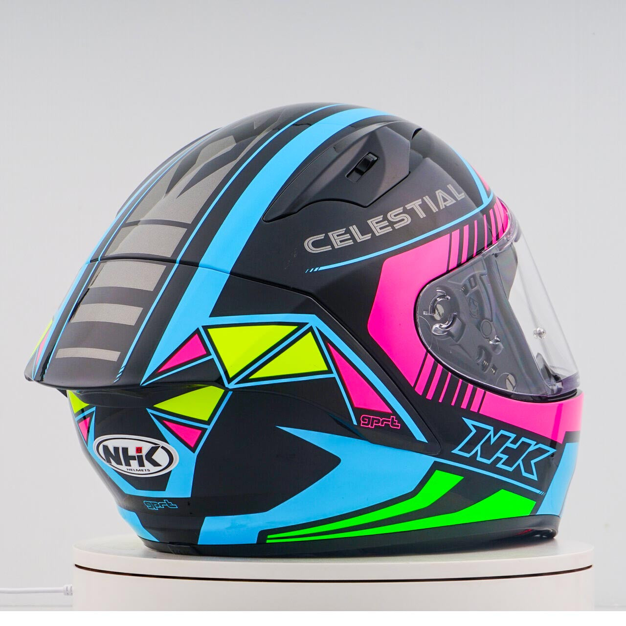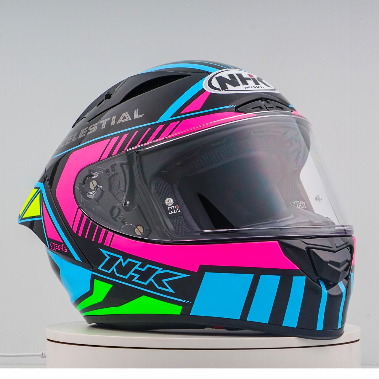 Experimente el mejor casco de motocicleta con la carrera tecnológica NHK GP-R, que es FIM y una carcasa compuesta compuesta de fibra de vidrio avanzada (AFRC) (AFRC) en cinco tamaños que garantizan un ajuste y protección perfectos. El AFRC es un material compuesto que consiste en una matriz y fibras de refuerzo. La matriz suele ser un polímero (por ejemplo, resina epoxi), mientras que las fibras de refuerzo están hechas de fibras de vidrio. Con nueve tamaños de concha interno y doce tamaños de casco, siempre encontrará el ajuste ideal. Nuestro sistema de ventilación 4D-Air garantiza una ventilación óptima y un ajuste cómodo, mientras que el forro interno premium y cómodo ofrece la máxima comodidad. El casco se probó aerodinámicamente en las clases de MotoGP y tiene una visera plana con "vista de gran angular" para un campo de visión extendido. La visera PIN-Lock y la lista de lágrimas garantiza una visión clara de todas las condiciones. Gracias al sistema de visor mecánico 100% completo, cambiar el visor es fácil y rápido. El revestimiento interno extraíble y lavable asegura un cuidado e higiene fácil. El casco también está preparado para una "bolsa de camello" y se puede transportar fácilmente con gafas. El sistema de retención de anillo de doble D y la mejilla para la aceptación ofrecen seguridad y estabilidad adicionales. El casco se probó en el túnel de viento para garantizar el mejor rendimiento a alta velocidad.