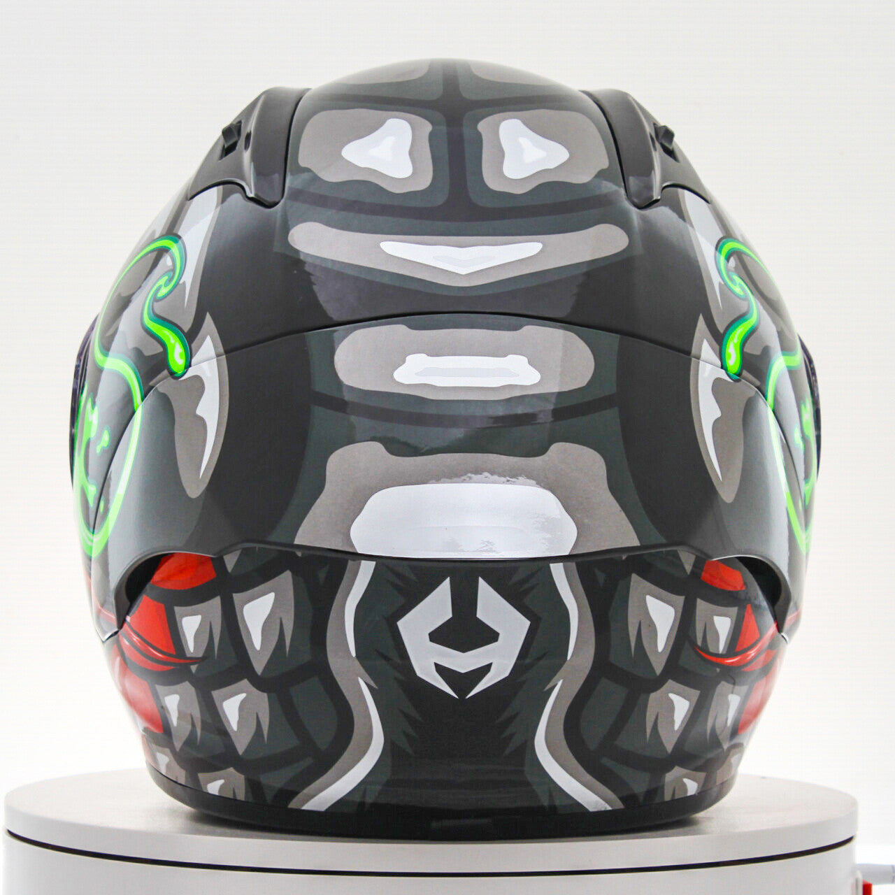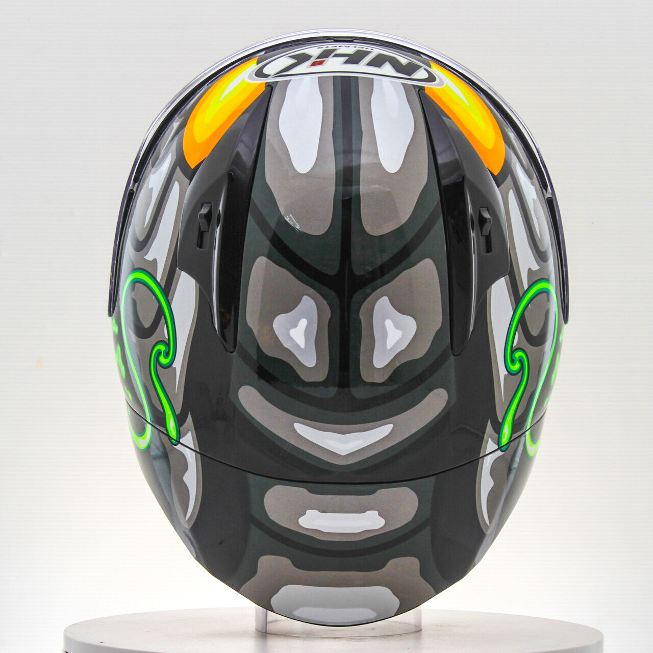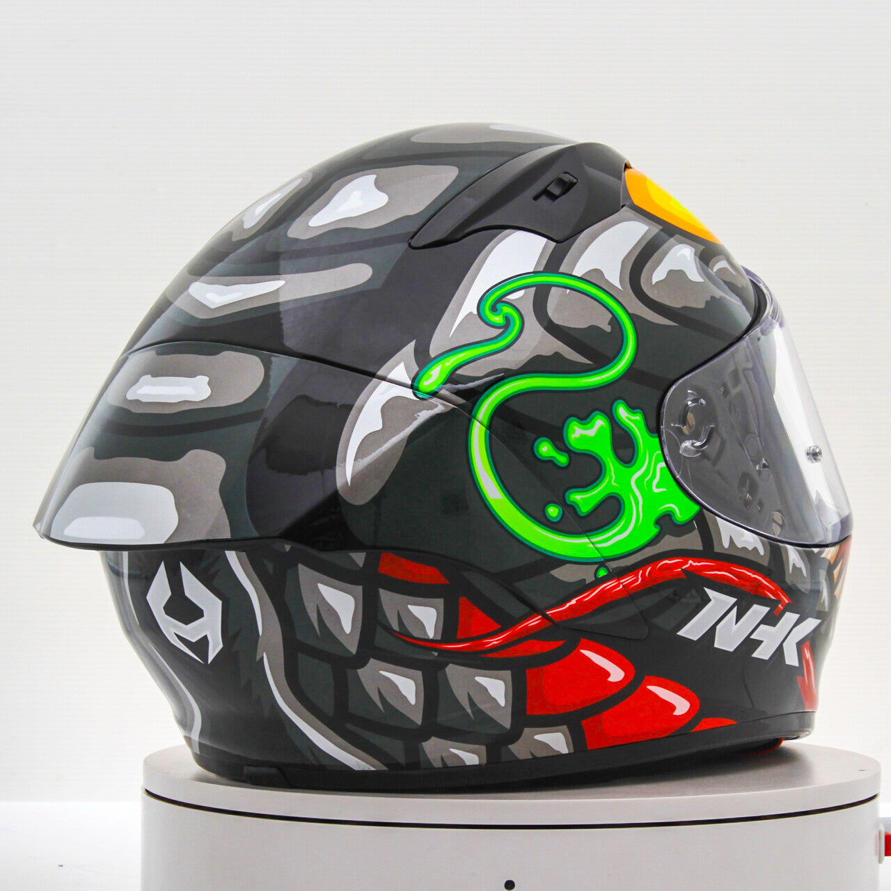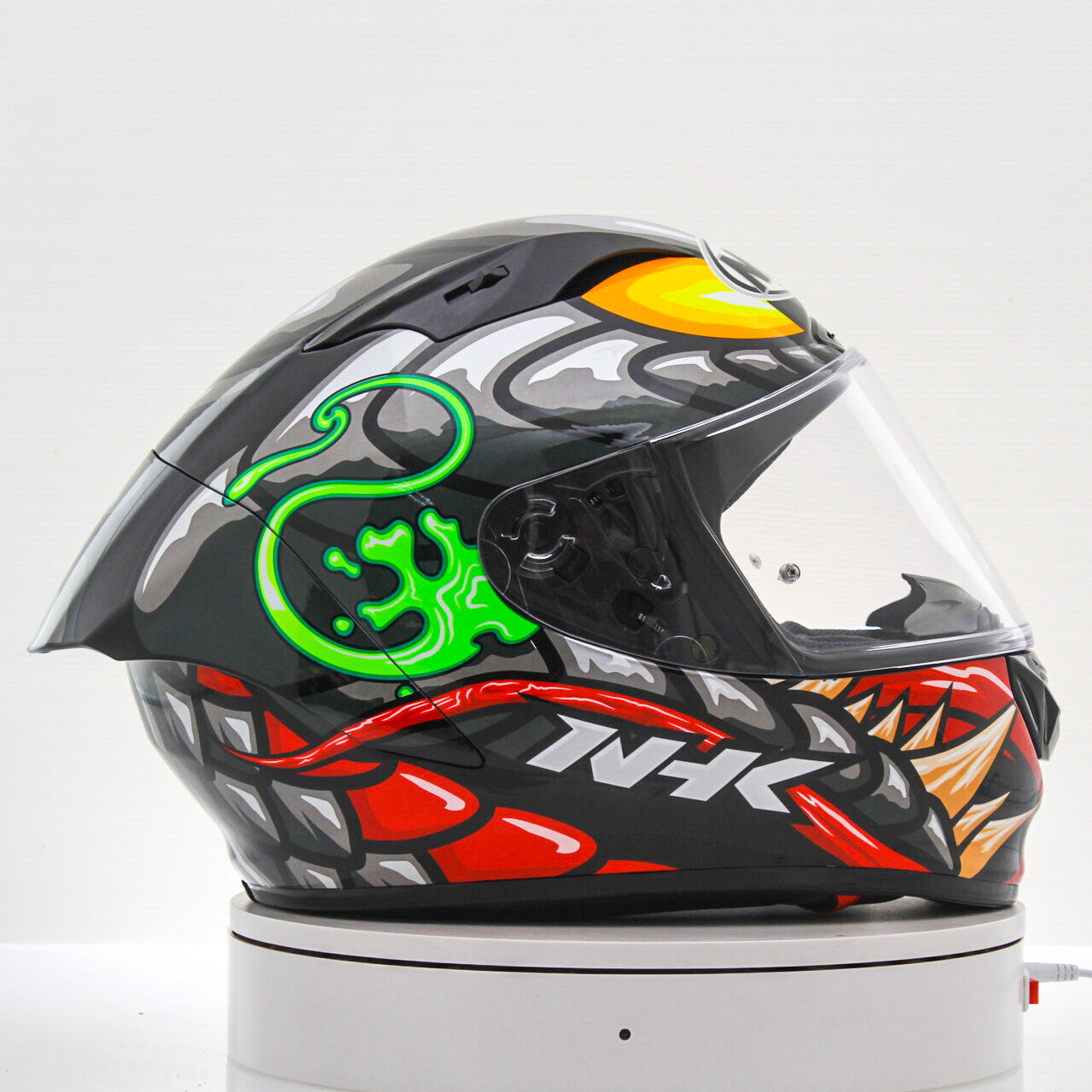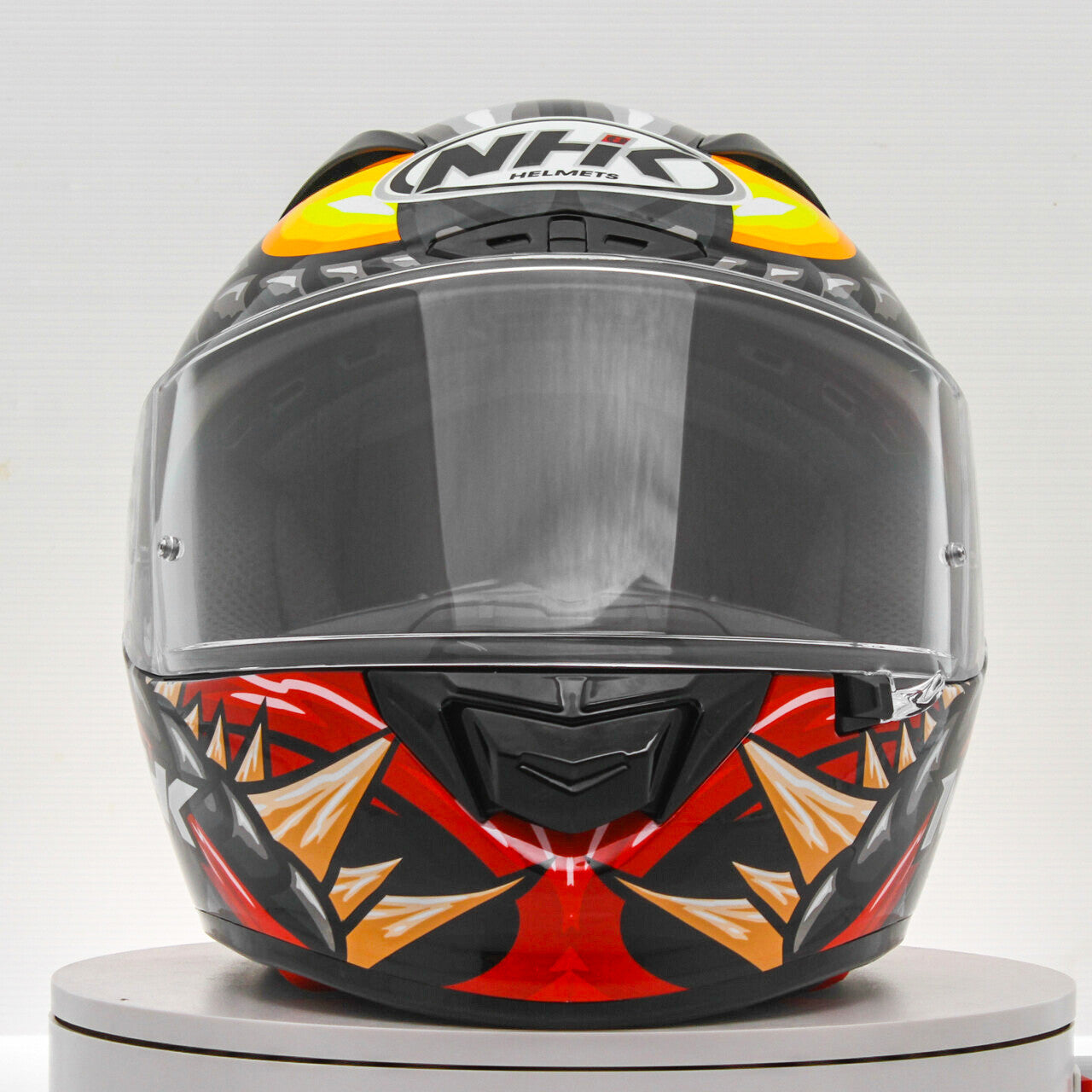 Experimente el mejor casco de motocicleta con la carrera tecnológica NHK GP-R, que es FIM y una carcasa compuesta compuesta de fibra de vidrio avanzada (AFRC) (AFRC) en cinco tamaños que garantizan un ajuste y protección perfectos. El AFRC es un material compuesto que consiste en una matriz y fibras de refuerzo. La matriz suele ser un polímero (por ejemplo, resina epoxi), mientras que las fibras de refuerzo están hechas de fibras de vidrio. Con nueve tamaños de concha interno y doce tamaños de casco, siempre encontrará el ajuste ideal. Nuestro sistema de ventilación 4D-Air garantiza una ventilación óptima y un ajuste cómodo, mientras que el forro interno premium y cómodo ofrece la máxima comodidad. El casco se probó aerodinámicamente en las clases de MotoGP y tiene una visera plana con "vista de gran angular" para un campo de visión extendido. La visera PIN-Lock y la lista de lágrimas garantiza una visión clara de todas las condiciones. Gracias al sistema de visor mecánico 100% completo, cambiar el visor es fácil y rápido. El revestimiento interno extraíble y lavable asegura un cuidado e higiene fácil. El casco también está preparado para una "bolsa de camello" y se puede transportar fácilmente con gafas. El sistema de retención de anillo de doble D y la mejilla para la aceptación ofrecen seguridad y estabilidad adicionales. El casco se probó en el túnel de viento para garantizar el mejor rendimiento a alta velocidad.