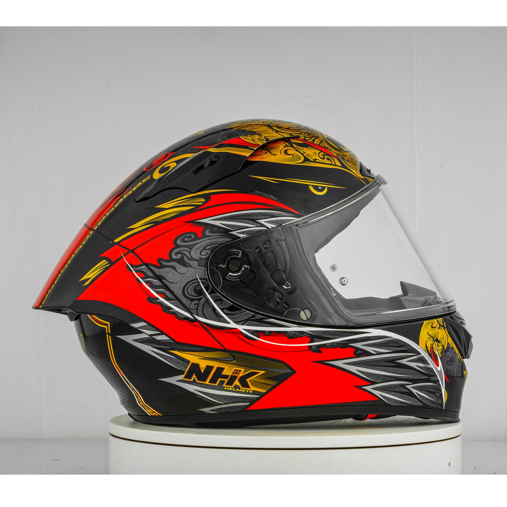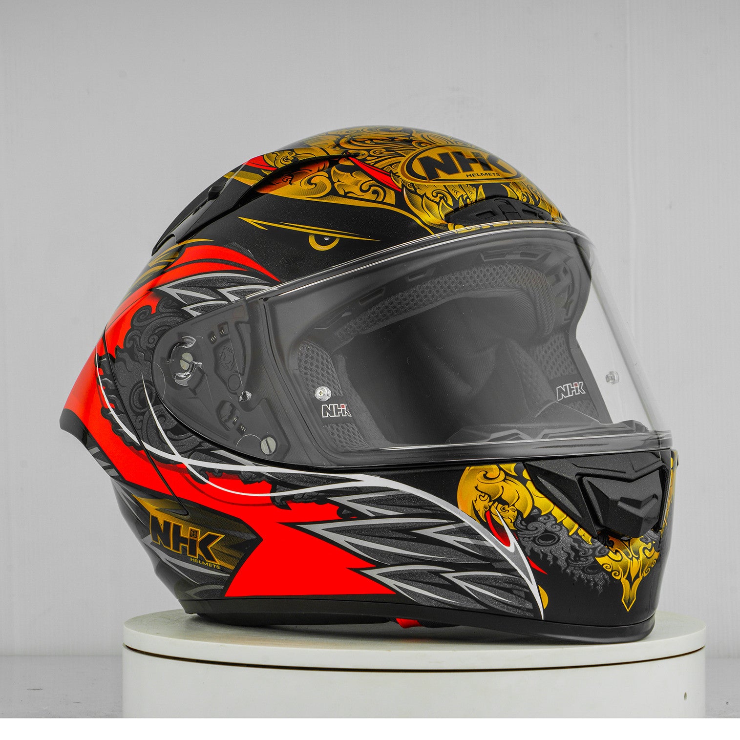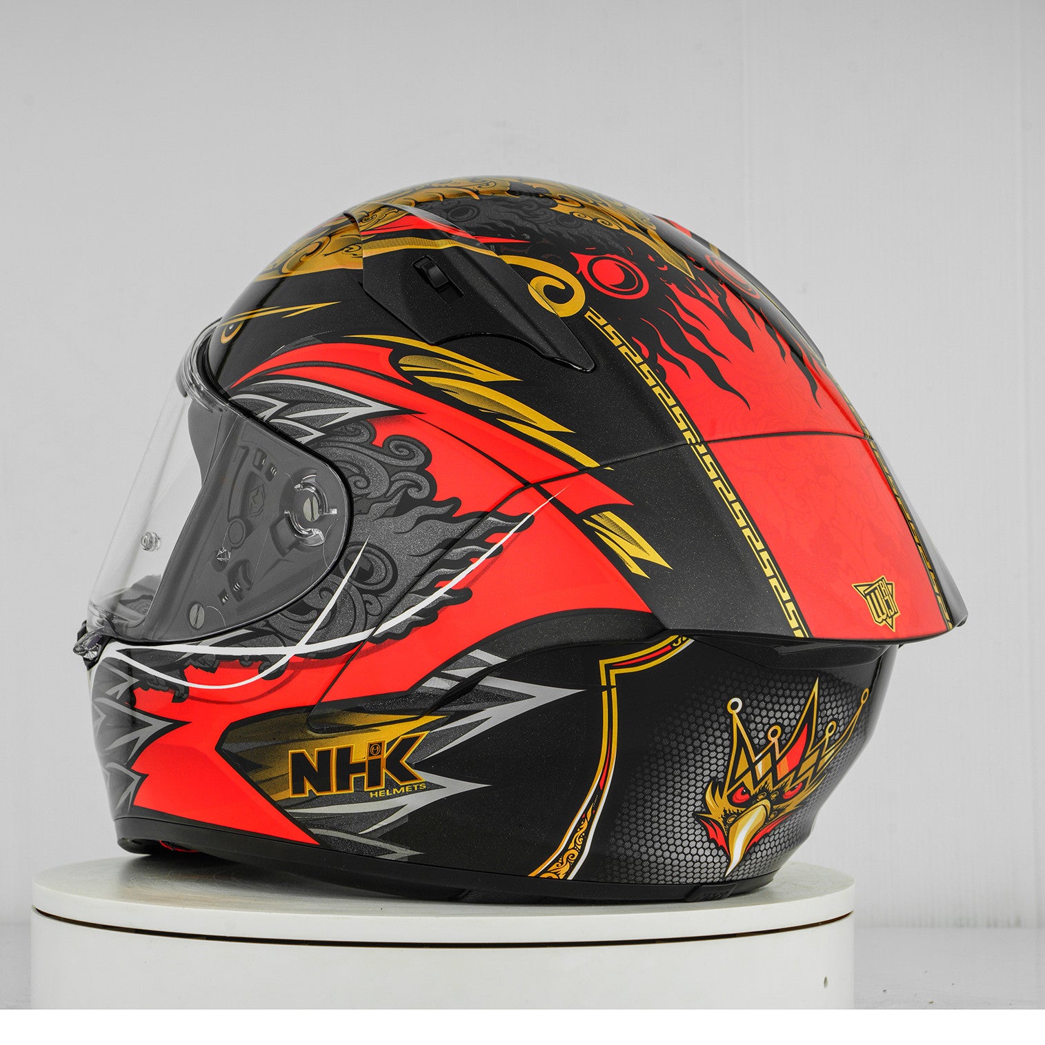 Experimente el mejor casco de motocicleta con la NHK GP-R Tech Race, que es FIM y un compuesto compuesto reforzado de fibra de vidrio avanzado (AFRC) en cinco tamaños que garantizan un ajuste y protección perfectos. El AFRC es un material compuesto que consiste en una matriz y fibras de refuerzo. La matriz suele ser un polímero (por ejemplo, resina epoxi), mientras que las fibras de refuerzo están hechas de fibras de vidrio. Con nueve tamaños de concha interno y doce tamaños de casco, siempre encontrará el ajuste ideal. Nuestro sistema de ventilación 4D-Air garantiza una ventilación óptima y un ajuste cómodo, mientras que el forro interno premium y cómodo ofrece la máxima comodidad. El casco se probó aerodinámicamente en las clases de MotoGP y tiene una visera plana con "vista de gran angular" para un campo de visión extendido. La visera PIN-Lock y la lista de lágrimas garantiza una visión clara de todas las condiciones. Gracias al sistema de visor mecánico 100% completo, cambiar el visor es fácil y rápido. El revestimiento interno extraíble y lavable asegura un cuidado e higiene fácil. El casco también está preparado para una "bolsa de camello" y se puede transportar fácilmente con gafas. El sistema de retención de anillo de doble D y la mejilla para la aceptación ofrecen seguridad y estabilidad adicionales. El casco se probó en el túnel de viento para garantizar el mejor rendimiento a alta velocidad.