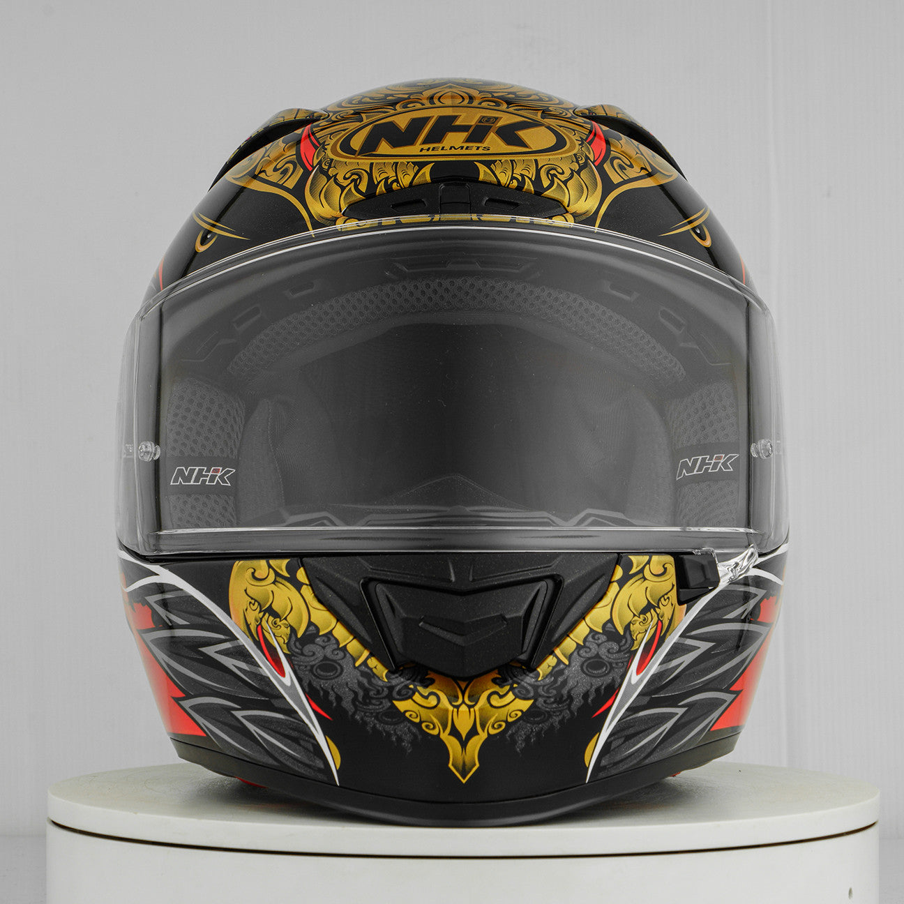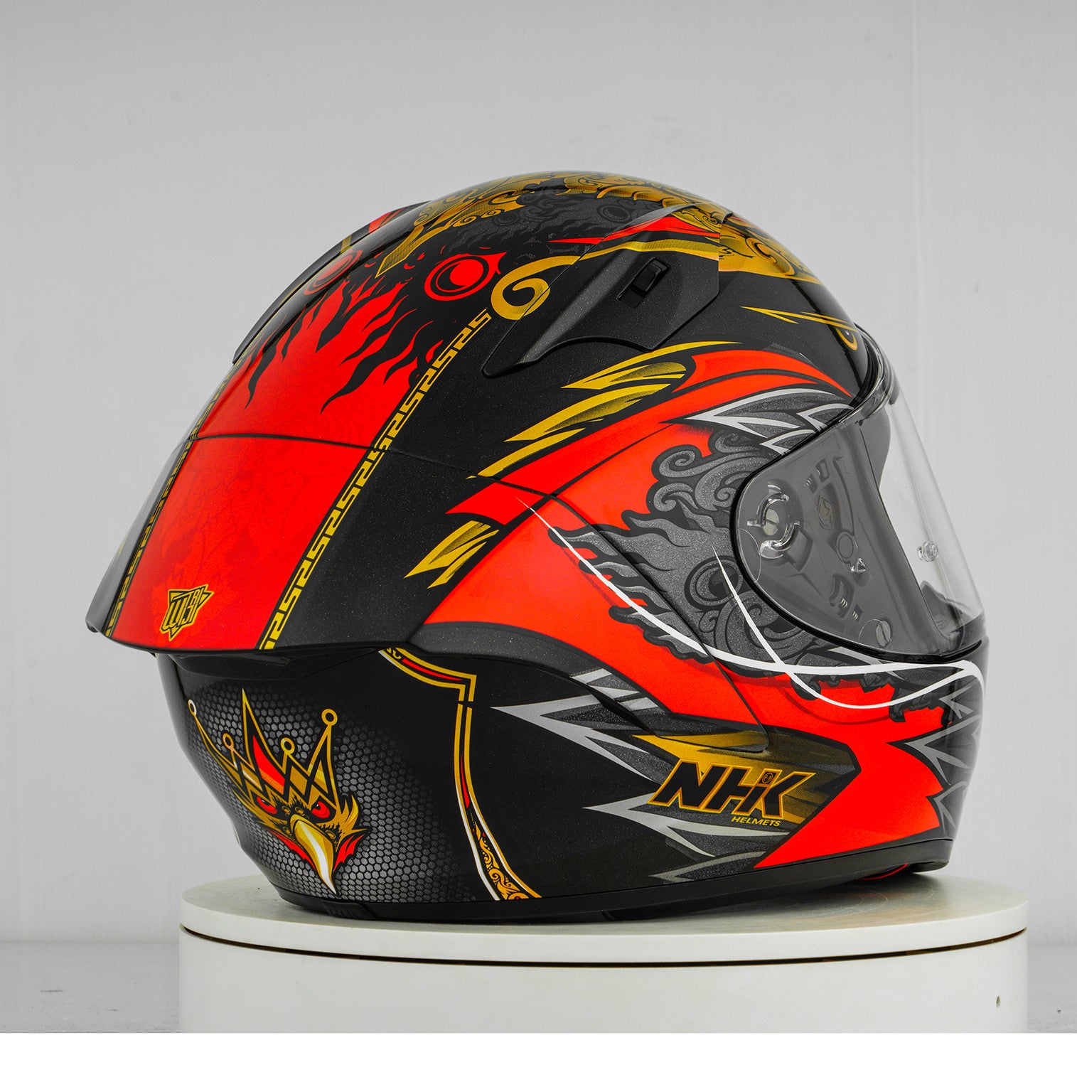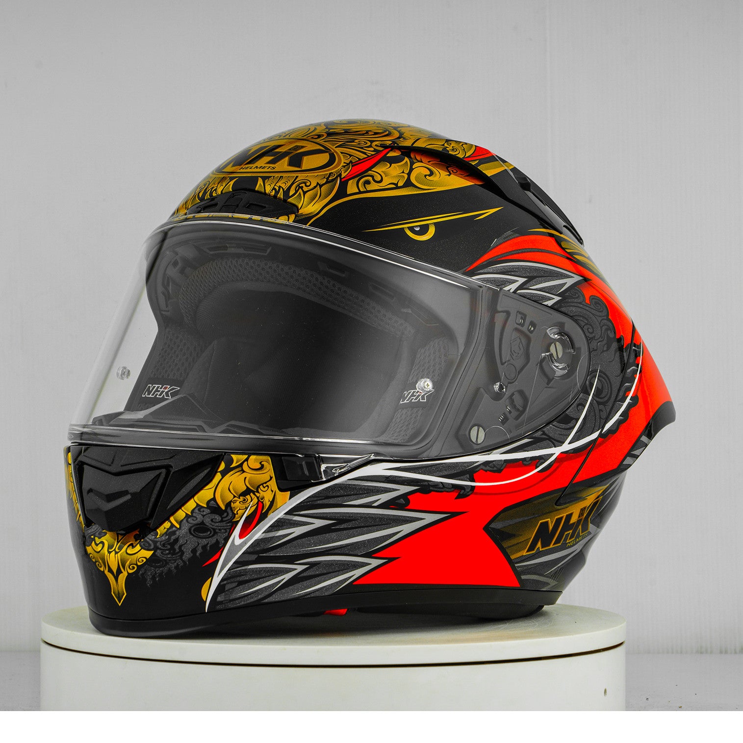 Experimente el mejor casco de motocicleta con la NHK GP-R Tech Race, que es FIM y un compuesto compuesto reforzado de fibra de vidrio avanzado (AFRC) en cinco tamaños que garantizan un ajuste y protección perfectos. El AFRC es un material compuesto que consiste en una matriz y fibras de refuerzo. La matriz suele ser un polímero (por ejemplo, resina epoxi), mientras que las fibras de refuerzo están hechas de fibras de vidrio. Con nueve tamaños de concha interno y doce tamaños de casco, siempre encontrará el ajuste ideal. Nuestro sistema de ventilación 4D-Air garantiza una ventilación óptima y un ajuste cómodo, mientras que el forro interno premium y cómodo ofrece la máxima comodidad. El casco se probó aerodinámicamente en las clases de MotoGP y tiene una visera plana con "vista de gran angular" para un campo de visión extendido. La visera PIN-Lock y la lista de lágrimas garantiza una visión clara de todas las condiciones. Gracias al sistema de visor mecánico 100% completo, cambiar el visor es fácil y rápido. El revestimiento interno extraíble y lavable asegura un cuidado e higiene fácil. El casco también está preparado para una "bolsa de camello" y se puede transportar fácilmente con gafas. El sistema de retención de anillo de doble D y la mejilla para la aceptación ofrecen seguridad y estabilidad adicionales. El casco se probó en el túnel de viento para garantizar el mejor rendimiento a alta velocidad.