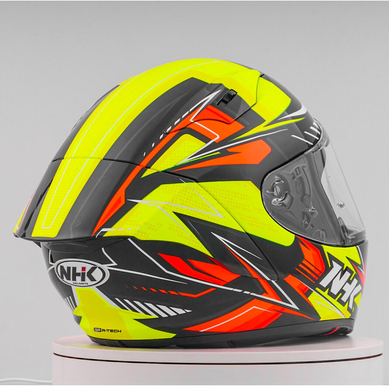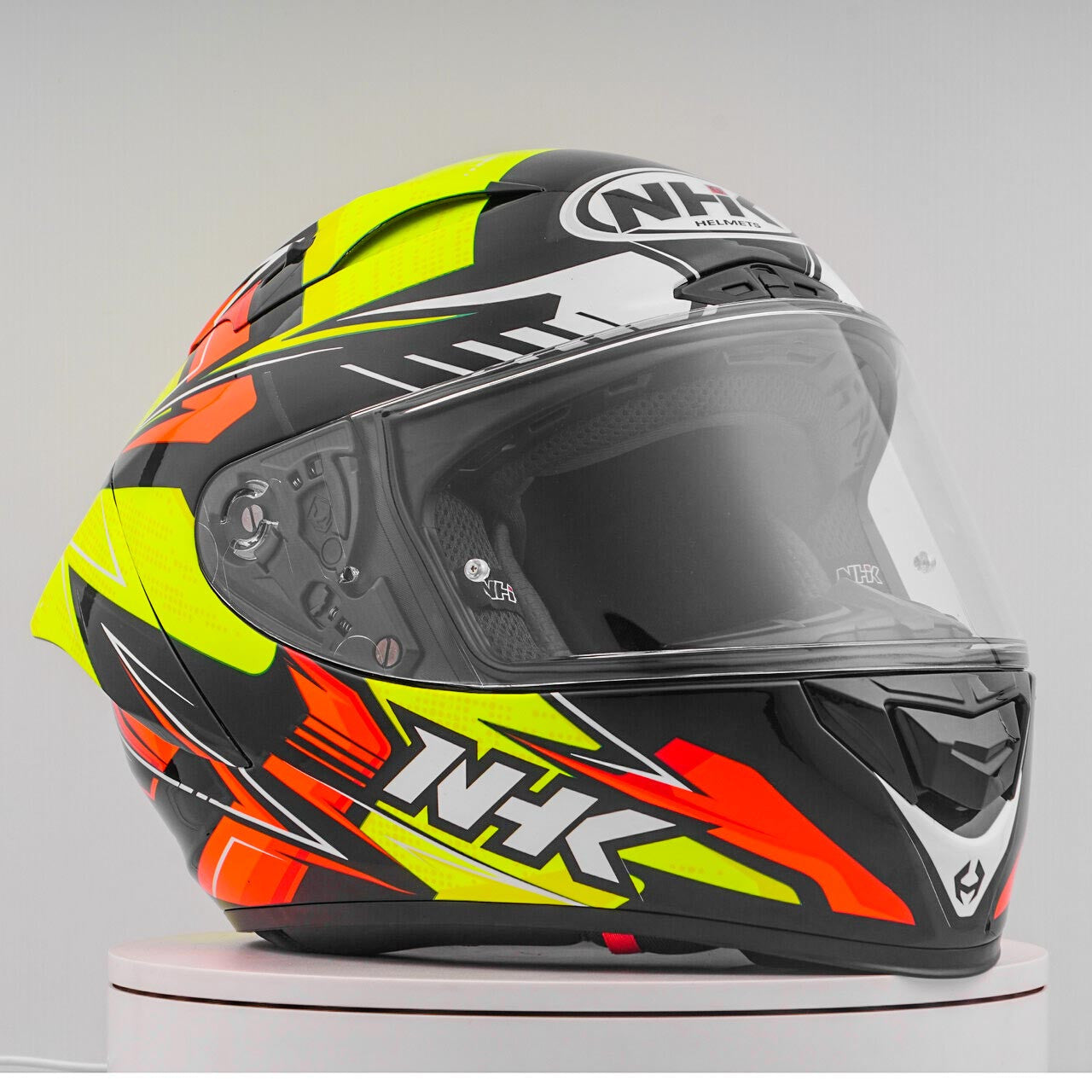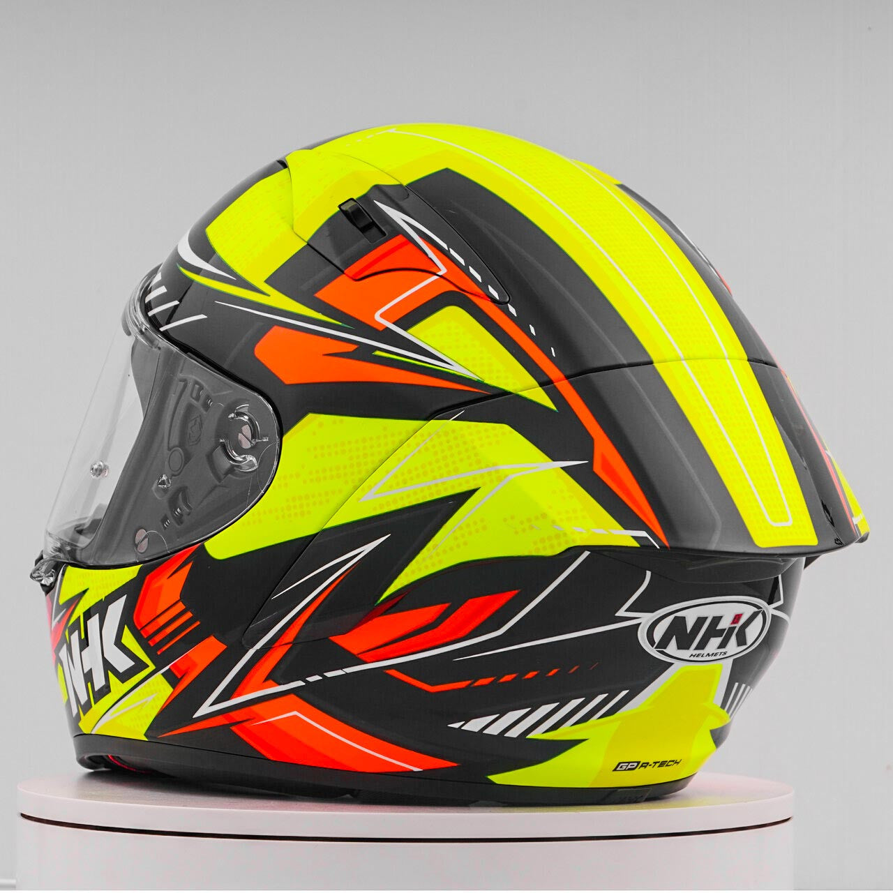 Sperimenta il casco per motociclisti per eccellenza con la NHK GP-R Tech Race, che è FIM e un (AFRC) (AFRC) avanzato guscio composito composito in fibra di vetro in cinque dimensioni che garantisce una perfetta vestibilità e protezione. L'AFRC è un materiale composito che consiste in una matrice e fibre di rinforzo. La matrice è di solito un polimero (ad esempio resina epossidica), mentre le fibre di rinforzo sono realizzate con fibre di vetro. Con nove dimensioni di guscio interne e dodici dimensioni del casco, troverai sempre la vestibilità ideale. Il nostro sistema di ventilazione a 4D aire garantisce una ventilazione ottimale e una vestibilità confortevole, mentre il rivestimento interno premium e confortevole offre il massimo comfort. Il casco è stato testato aerodinamicamente nelle classi MOTOGP e ha una visiera piatta con "vista angolare" per un campo visivo esteso. La visiera pronta per il blocco e la lacrima garantisce una visione chiara da tutte le condizioni. Grazie al sistema di visiera meccanica completa al 100%, cambiare la visiera è facile e veloce. Il rivestimento interno rimovibile e lavabile garantisce una facile cura e igiene. Il casco è anche preparato per una "borsa per cammello" e può essere facilmente trasportato con occhiali. Il sistema di ritenzione a doppia D Ring e la guancia per l'accettazione offrono ulteriore sicurezza e stabilità. Il casco è stato testato nella galleria del vento per garantire le migliori prestazioni ad alta velocità.