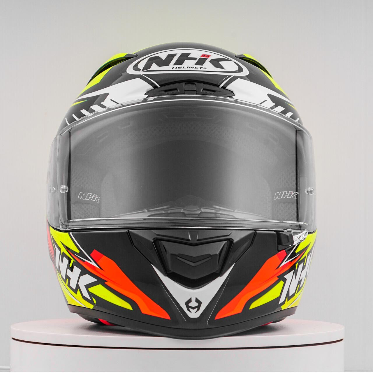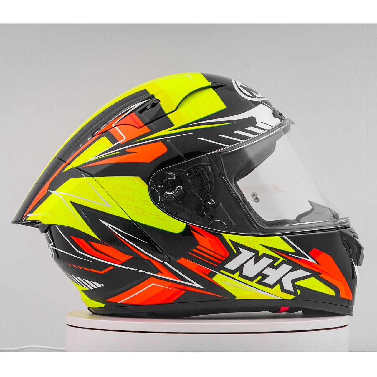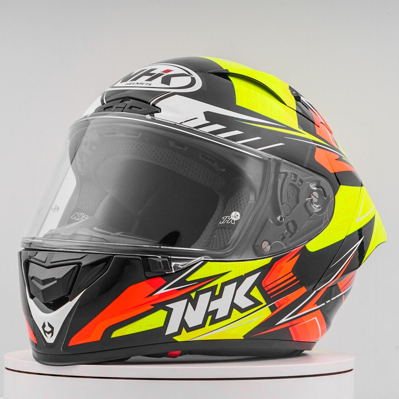 Sperimenta il casco per motociclisti per eccellenza con la NHK GP-R Tech Race, che è FIM e un (AFRC) (AFRC) avanzato guscio composito composito in fibra di vetro in cinque dimensioni che garantisce una perfetta vestibilità e protezione. L'AFRC è un materiale composito che consiste in una matrice e fibre di rinforzo. La matrice è di solito un polimero (ad esempio resina epossidica), mentre le fibre di rinforzo sono realizzate con fibre di vetro. Con nove dimensioni di guscio interne e dodici dimensioni del casco, troverai sempre la vestibilità ideale. Il nostro sistema di ventilazione a 4D aire garantisce una ventilazione ottimale e una vestibilità confortevole, mentre il rivestimento interno premium e confortevole offre il massimo comfort. Il casco è stato testato aerodinamicamente nelle classi MOTOGP e ha una visiera piatta con "vista angolare" per un campo visivo esteso. La visiera pronta per il blocco e la lacrima garantisce una visione chiara da tutte le condizioni. Grazie al sistema di visiera meccanica completa al 100%, cambiare la visiera è facile e veloce. Il rivestimento interno rimovibile e lavabile garantisce una facile cura e igiene. Il casco è anche preparato per una "borsa per cammello" e può essere facilmente trasportato con occhiali. Il sistema di ritenzione a doppia D Ring e la guancia per l'accettazione offrono ulteriore sicurezza e stabilità. Il casco è stato testato nella galleria del vento per garantire le migliori prestazioni ad alta velocità.