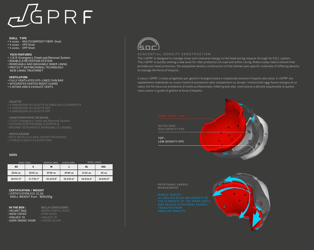 De J-GPRF is de meest innovatieve helm van Just1, speciaal ontwikkeld voor straat en racen. Met de S.D.C. Systeem (sequentiële dichtheidsconstructie), het biedt optimale bescherming tegen lineaire en roterende krachten in het geval van effecten. Materialen met verschillende dicht dicht absorberen de energie om het hoofd zo goed mogelijk te beschermen.