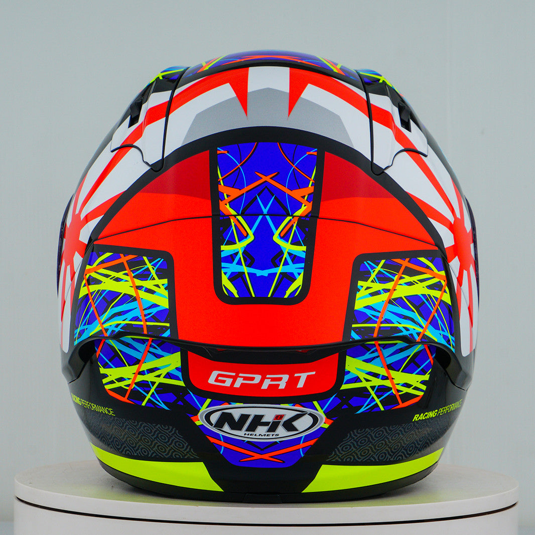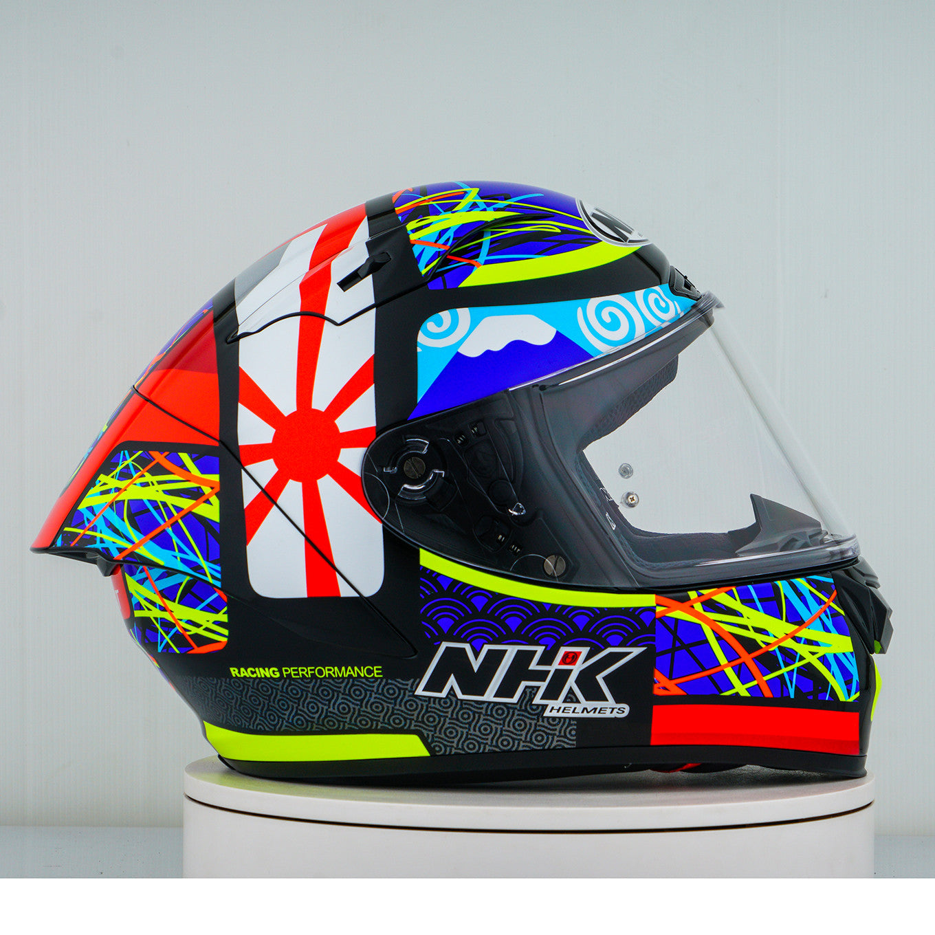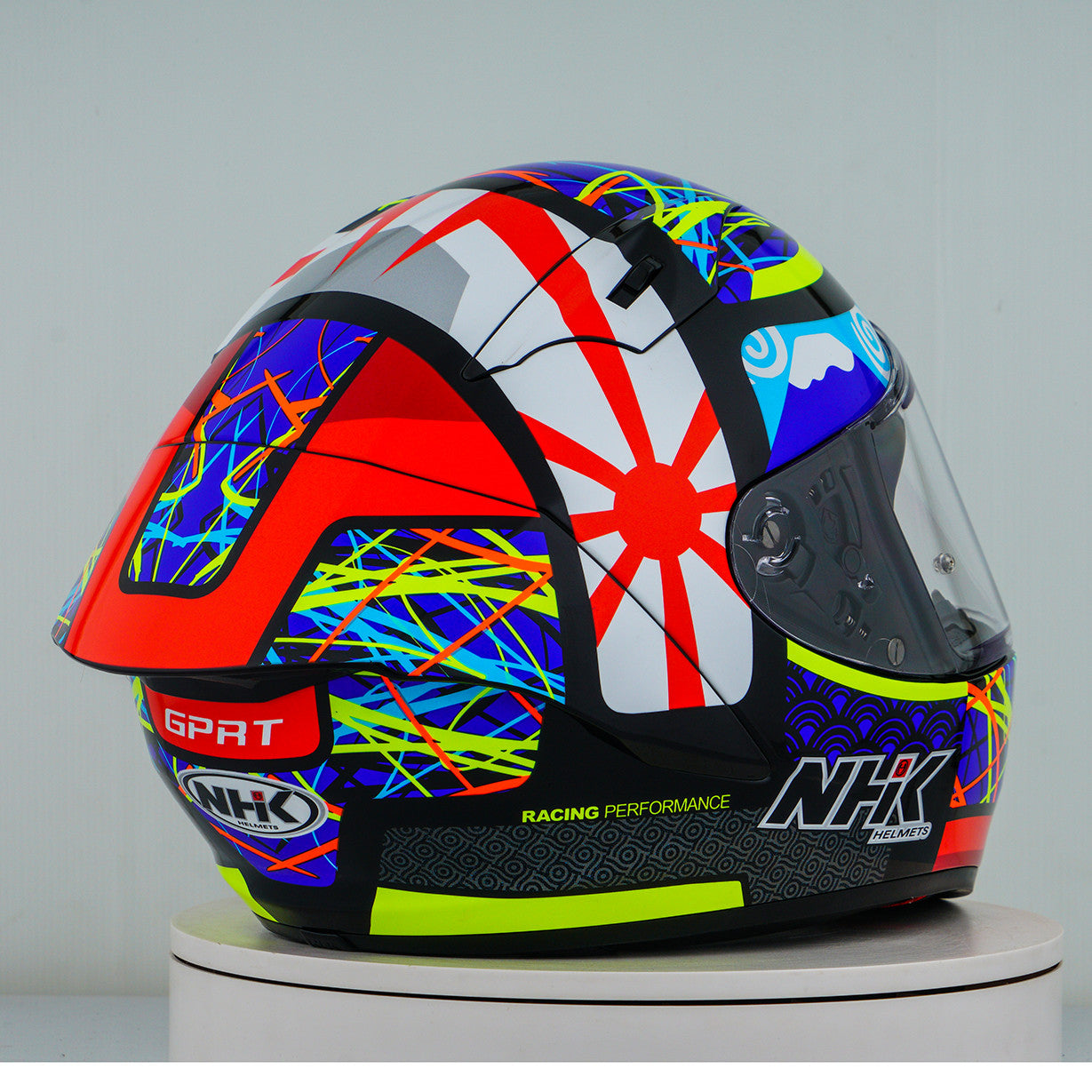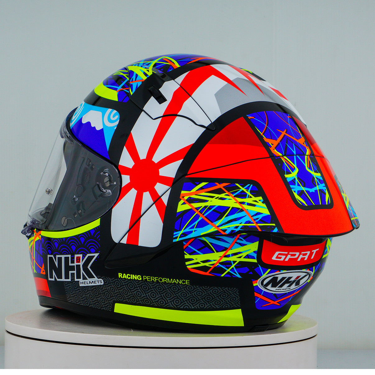 Ervaar de ultieme motorhelm met de NHK GP-R Tech Race, die FIM is en een (AFRC) geavanceerde glasvezelversterkte composietcomposiet in vijf maten die perfecte pasvorm en bescherming garanderen. De AFRC is een samengesteld materiaal dat bestaat uit een matrix- en versterkingsvezels. De matrix is meestal een polymeer (bijv. Epoxyhars), terwijl de versterkingsvezels zijn gemaakt van glasvezels. Met negen binnenste schaalgroottes en twaalf helmgroottes vindt u altijd de ideale pasvorm. Ons 4D-air ventilatiesysteem zorgt voor een optimale ventilatie en een comfortabele pasvorm, terwijl de premium en comfortabele binnenvoering maximaal comfort biedt. De helm werd aerodynamisch getest in de MOTOGP -klassen en heeft een plat vizier met "groothoekaanzicht" voor een uitgebreid gezichtsveld. Het pin-lock & aftak-ready vizier zorgt voor een duidelijk zicht vanuit alle omstandigheden. Dankzij het 100% volledige mechanische viziersysteem is het veranderen van het vizier eenvoudig en snel. De verwijderbare en wasbare binnenvoering zorgt voor gemakkelijke verzorging en hygiëne. De helm is ook bereid voor een "kameeltas" en kan gemakkelijk worden gedragen met een bril. Het Double D Ring Retention -systeem en de wang voor acceptatie bieden extra beveiliging en stabiliteit. De helm werd getest in de windtunnel om de beste prestaties met hoge snelheid te garanderen.