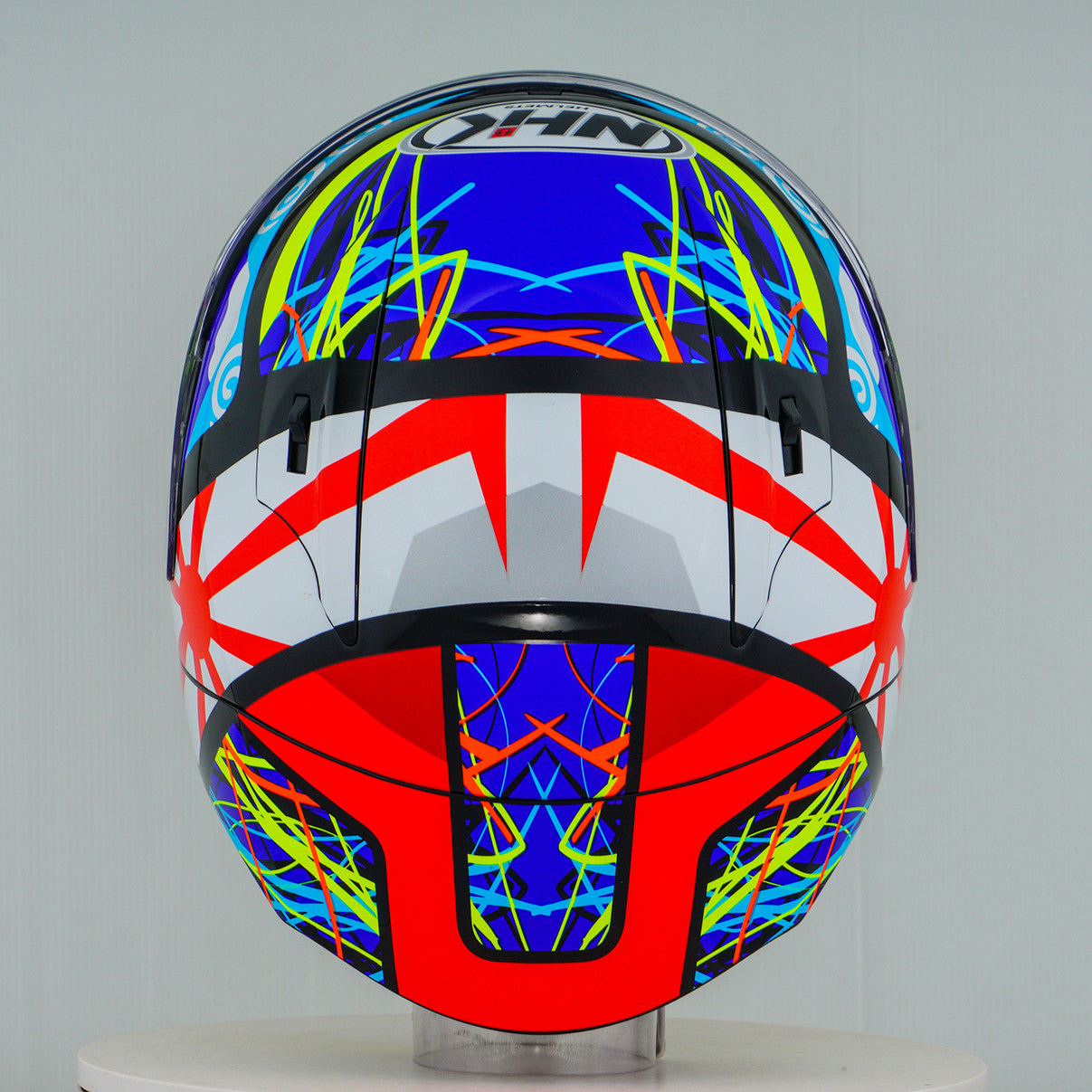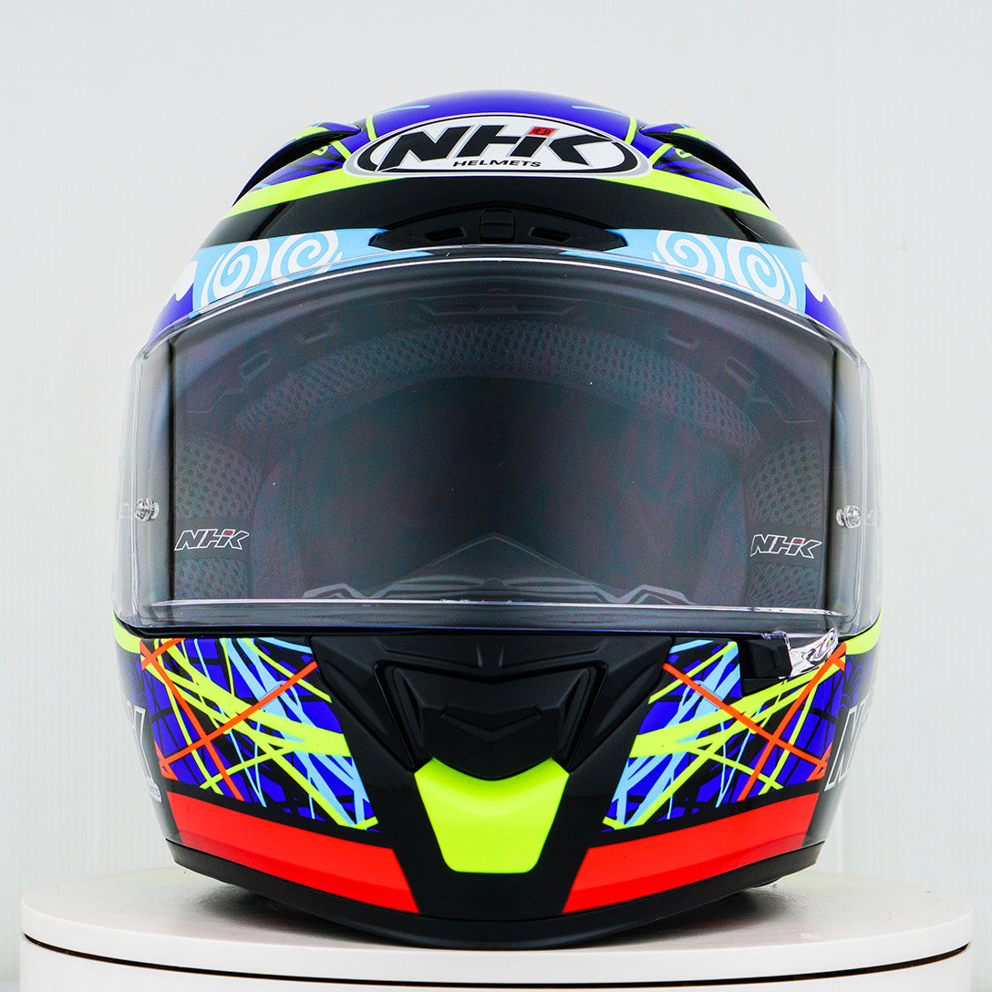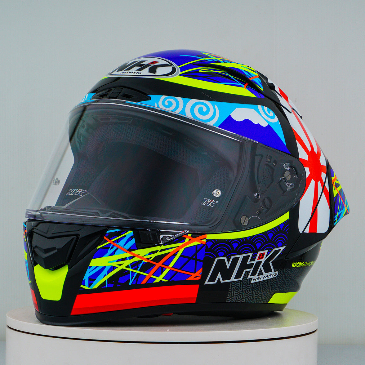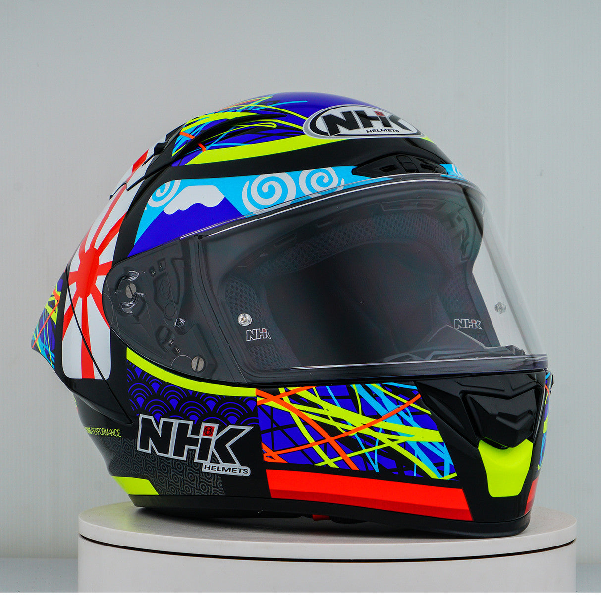 Ervaar de ultieme motorhelm met de NHK GP-R Tech Race, die FIM is en een (AFRC) geavanceerde glasvezelversterkte composietcomposiet in vijf maten die perfecte pasvorm en bescherming garanderen. De AFRC is een samengesteld materiaal dat bestaat uit een matrix- en versterkingsvezels. De matrix is meestal een polymeer (bijv. Epoxyhars), terwijl de versterkingsvezels zijn gemaakt van glasvezels. Met negen binnenste schaalgroottes en twaalf helmgroottes vindt u altijd de ideale pasvorm. Ons 4D-air ventilatiesysteem zorgt voor een optimale ventilatie en een comfortabele pasvorm, terwijl de premium en comfortabele binnenvoering maximaal comfort biedt. De helm werd aerodynamisch getest in de MOTOGP -klassen en heeft een plat vizier met "groothoekaanzicht" voor een uitgebreid gezichtsveld. Het pin-lock & aftak-ready vizier zorgt voor een duidelijk zicht vanuit alle omstandigheden. Dankzij het 100% volledige mechanische viziersysteem is het veranderen van het vizier eenvoudig en snel. De verwijderbare en wasbare binnenvoering zorgt voor gemakkelijke verzorging en hygiëne. De helm is ook bereid voor een "kameeltas" en kan gemakkelijk worden gedragen met een bril. Het Double D Ring Retention -systeem en de wang voor acceptatie bieden extra beveiliging en stabiliteit. De helm werd getest in de windtunnel om de beste prestaties met hoge snelheid te garanderen.