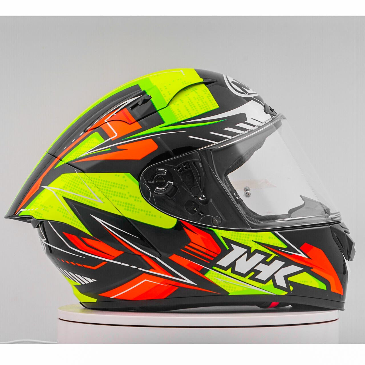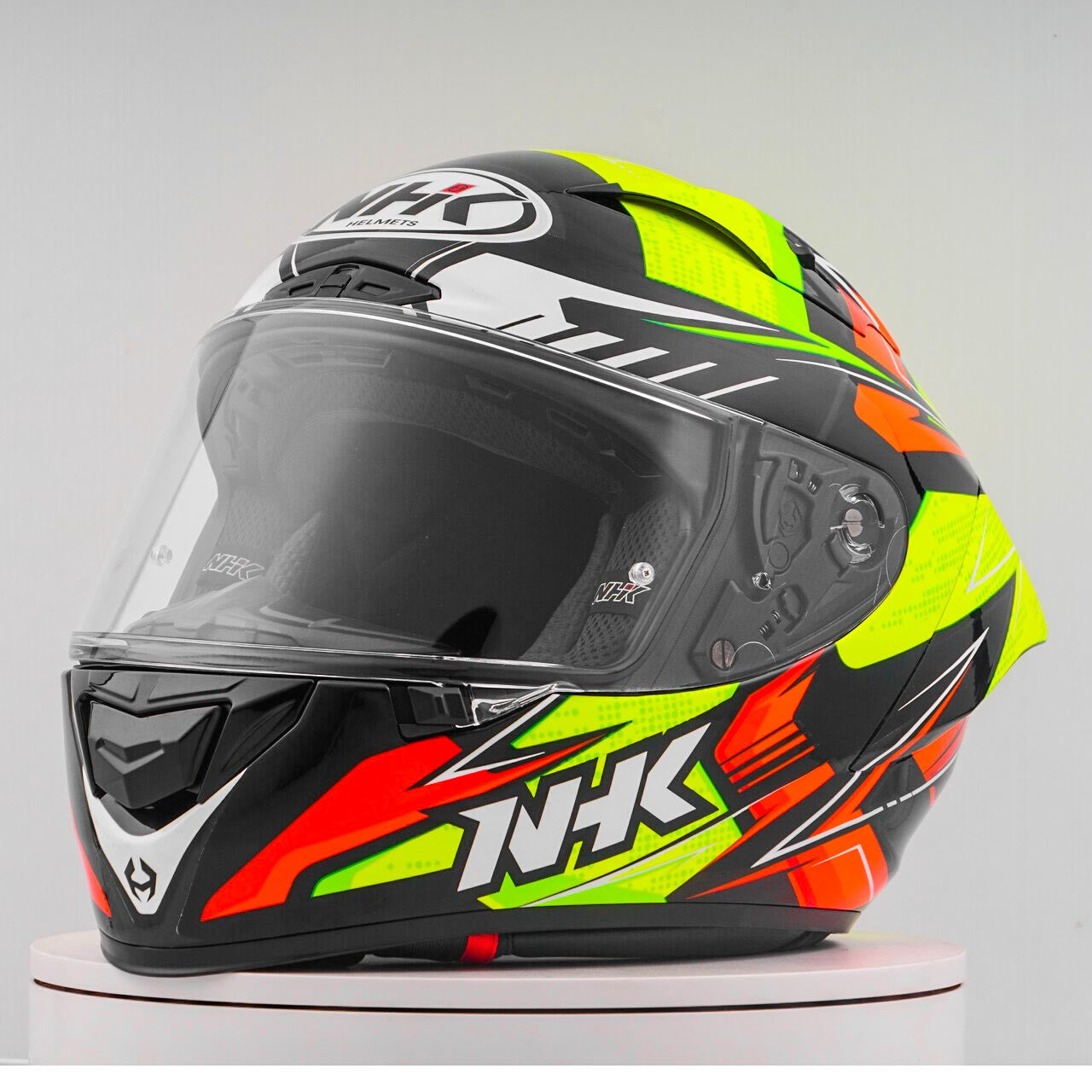 Ervaar de ultieme motorhelm met de NHK GP-R Tech Race, die FIM is en een (AFRC) geavanceerde glasvezelversterkte composietcomposietschaal in vijf maten die perfecte pasvorm en bescherming garanderen. De AFRC is een samengesteld materiaal dat bestaat uit een matrix- en versterkingsvezels. De matrix is meestal een polymeer (bijv. Epoxyhars), terwijl de versterkingsvezels zijn gemaakt van glasvezels. Met negen binnenste schaalgroottes en twaalf helmgroottes vindt u altijd de ideale pasvorm. Ons 4D-air ventilatiesysteem zorgt voor een optimale ventilatie en een comfortabele pasvorm, terwijl de premium en comfortabele binnenvoering maximaal comfort biedt. De helm werd aerodynamisch getest in de MOTOGP -klassen en heeft een plat vizier met "groothoekaanzicht" voor een uitgebreid gezichtsveld. Het pin-lock & aftak-ready vizier zorgt voor een duidelijk zicht vanuit alle omstandigheden. Dankzij het 100% volledige mechanische viziersysteem is het veranderen van het vizier eenvoudig en snel. De verwijderbare en wasbare binnenvoering zorgt voor gemakkelijke verzorging en hygiëne. De helm is ook bereid voor een "kameeltas" en kan gemakkelijk worden gedragen met een bril. Het Double D Ring Retention -systeem en de wang voor acceptatie bieden extra beveiliging en stabiliteit. De helm werd getest in de windtunnel om de beste prestaties met hoge snelheid te garanderen.