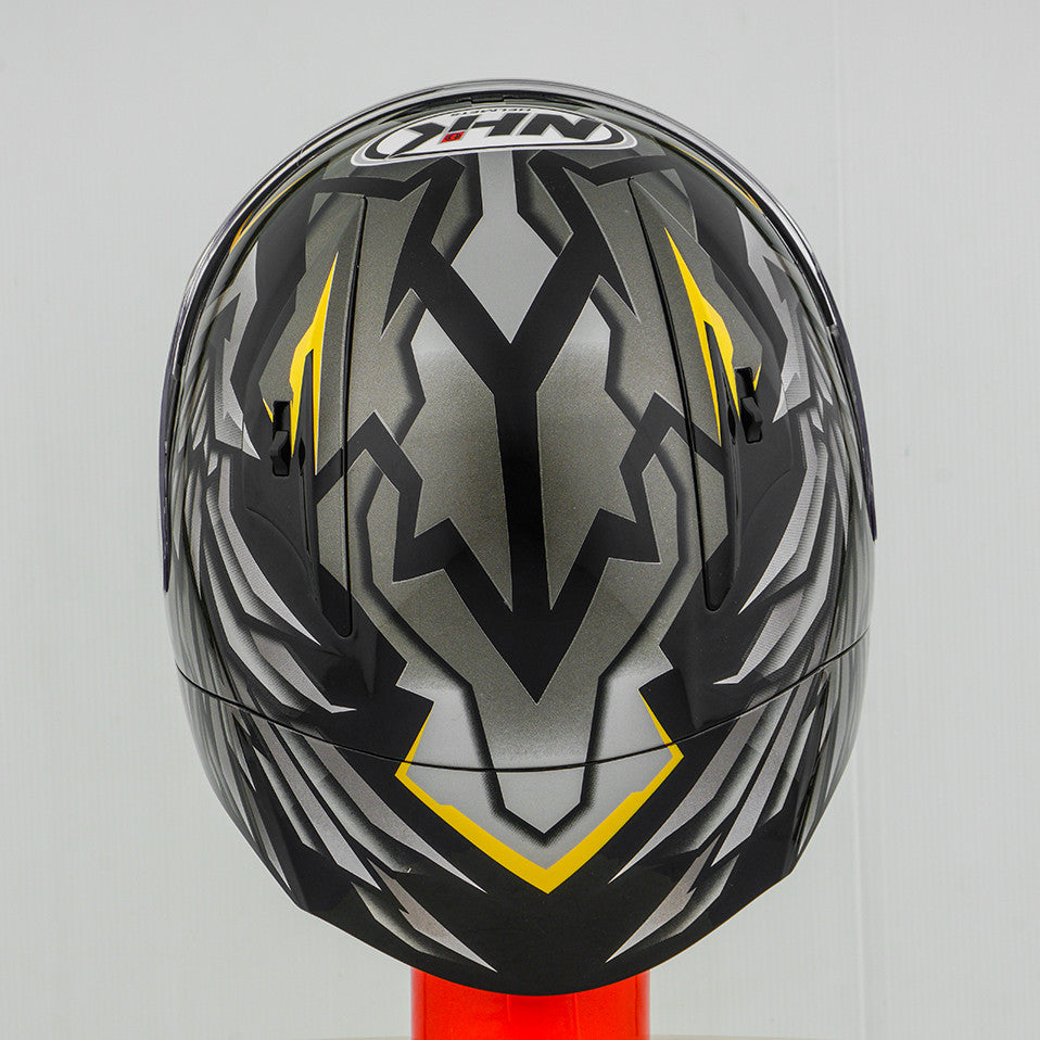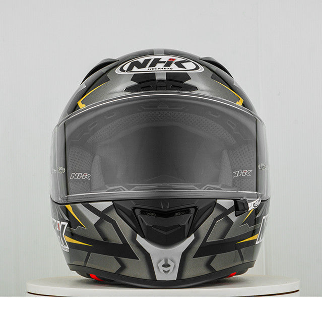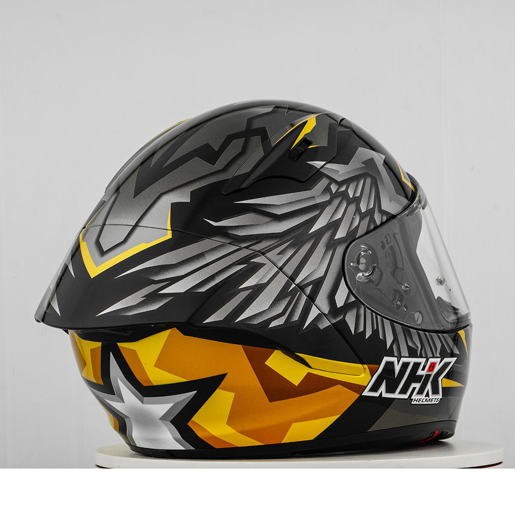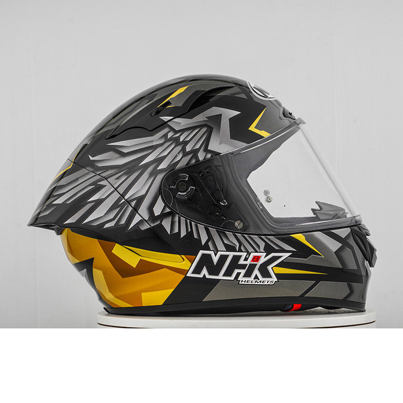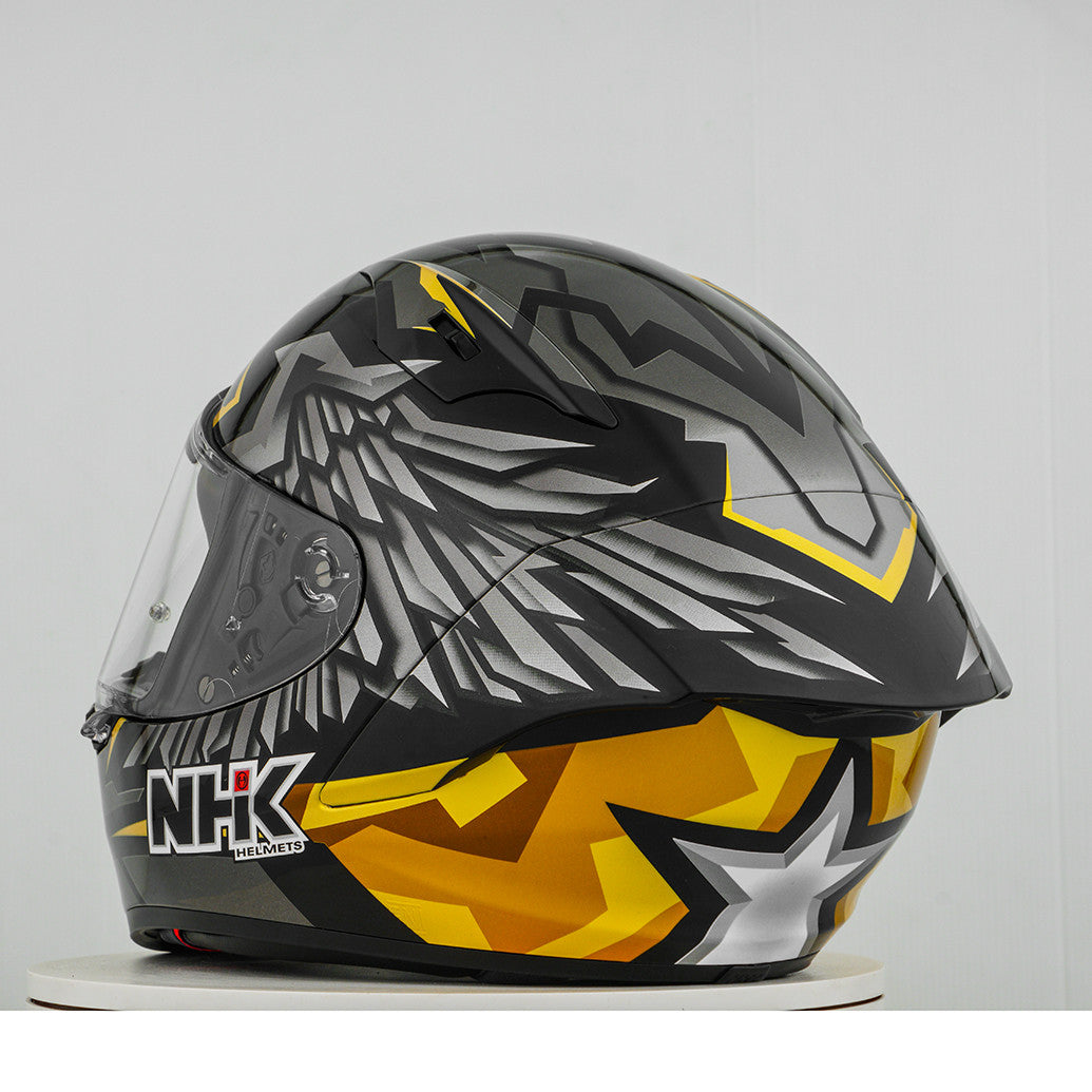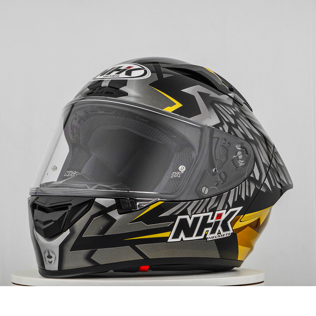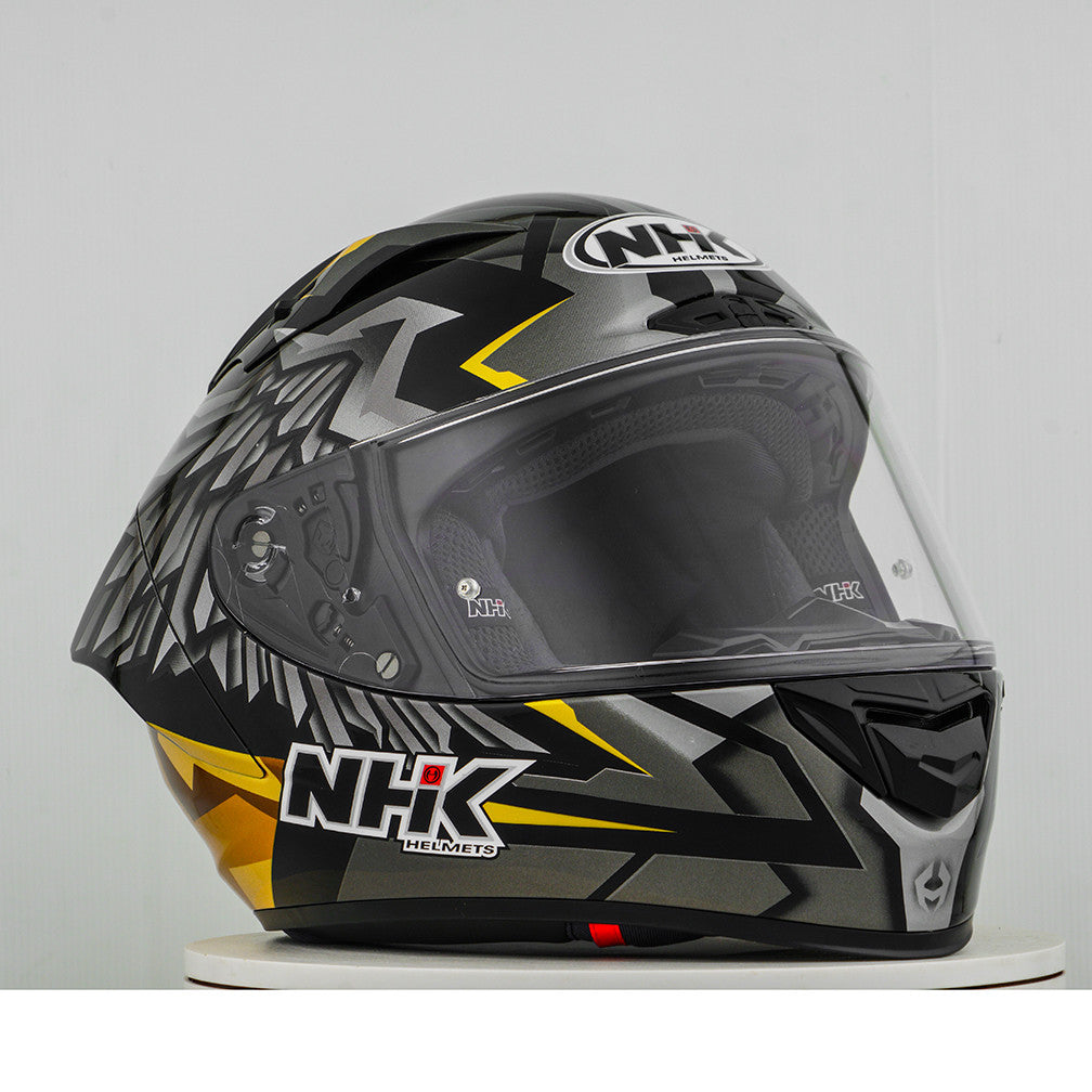 Ervaar de ultieme motorhelm met de NHK GP-R Tech Race, die FIM is en een (AFRC) geavanceerde glasvezelversterkte composietcomposiet in vijf maten die perfecte pasvorm en bescherming garanderen. De AFRC is een samengesteld materiaal dat bestaat uit een matrix- en versterkingsvezels. De matrix is meestal een polymeer (bijv. Epoxyhars), terwijl de versterkingsvezels zijn gemaakt van glasvezels. Met negen binnenste schaalgroottes en twaalf helmgroottes vindt u altijd de ideale pasvorm. Ons 4D-air ventilatiesysteem zorgt voor een optimale ventilatie en een comfortabele pasvorm, terwijl de premium en comfortabele binnenvoering maximaal comfort biedt. De helm werd aerodynamisch getest in de MOTOGP -klassen en heeft een plat vizier met "groothoekaanzicht" voor een uitgebreid gezichtsveld. Het pin-lock & aftak-ready vizier zorgt voor een duidelijk zicht vanuit alle omstandigheden. Dankzij het 100% volledige mechanische viziersysteem is het veranderen van het vizier eenvoudig en snel. De verwijderbare en wasbare binnenvoering zorgt voor gemakkelijke verzorging en hygiëne. De helm is ook bereid voor een "kameeltas" en kan gemakkelijk worden gedragen met een bril. Het Double D Ring Retention -systeem en de wang voor acceptatie bieden extra beveiliging en stabiliteit. De helm werd getest in de windtunnel om de beste prestaties met hoge snelheid te garanderen.