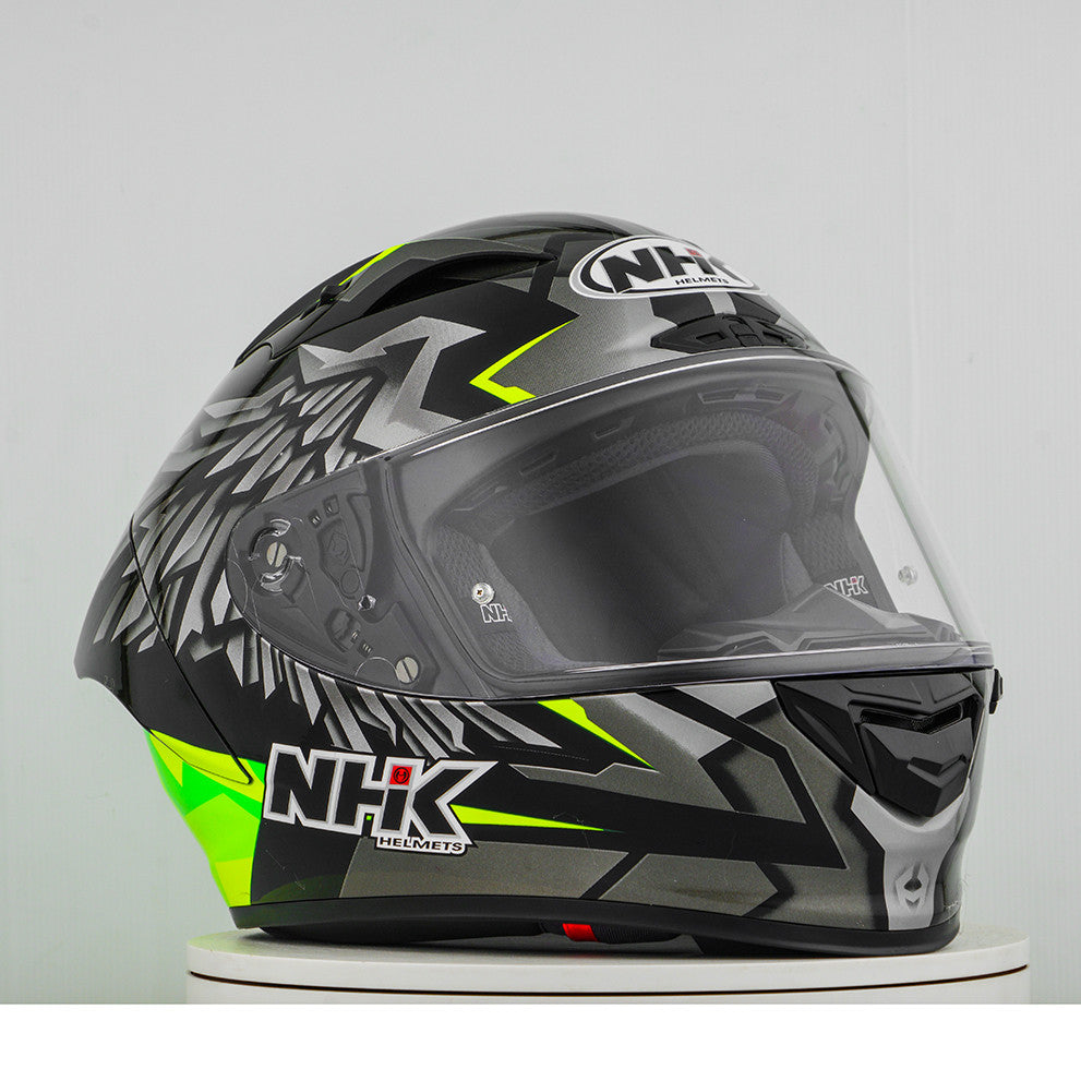 Ervaar de ultieme motorhelm met de NHK GP-R Tech Race, die FIM is en een (AFRC) geavanceerde glasvezelversterkte composietcomposiet in vijf maten die perfecte pasvorm en bescherming garanderen. De AFRC is een samengesteld materiaal dat bestaat uit een matrix- en versterkingsvezels. De matrix is ​​meestal een polymeer (bijv. Epoxyhars), terwijl de versterkingsvezels zijn gemaakt van glasvezels. Met negen binnenste schaalgroottes en twaalf helmgroottes vindt u altijd de ideale pasvorm. Ons 4D-air ventilatiesysteem zorgt voor een optimale ventilatie en een comfortabele pasvorm, terwijl de premium en comfortabele binnenvoering maximaal comfort biedt. De helm werd aerodynamisch getest in de MOTOGP -klassen en heeft een plat vizier met "groothoekaanzicht" voor een uitgebreid gezichtsveld. Het pin-lock & aftak-ready vizier zorgt voor een duidelijk zicht vanuit alle omstandigheden. Dankzij het 100% volledige mechanische viziersysteem is het veranderen van het vizier eenvoudig en snel. De verwijderbare en wasbare binnenvoering zorgt voor gemakkelijke verzorging en hygiëne. De helm is ook bereid voor een "kameeltas" en kan gemakkelijk worden gedragen met een bril. Het Double D Ring Retention -systeem en de wang voor acceptatie bieden extra beveiliging en stabiliteit. De helm werd getest in de windtunnel om de beste prestaties met hoge snelheid te garanderen.