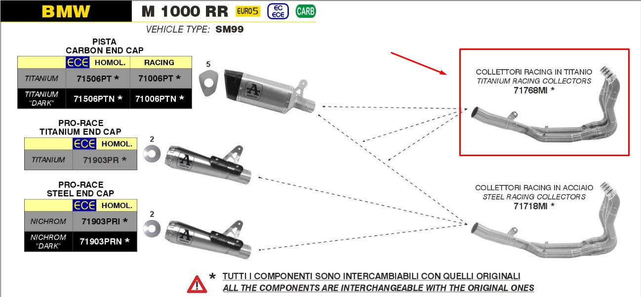 Le Arrow Krümmer 71768mi était spécifiquement pour le BMW M1000RR K66 (Building Years 2021-2025) a développé et en assure un Augmentation des performances optimisées Et un amélioré Hypothèse de gaz. Ce Collecteur en titane permet l'utilisation du Amortisseurs sonores finaux d'origine Ou peut être avec différent Slip-on de la flèche (par exemple 71506 ou 71903) Combinez pour créer un système complet puissant. Pour un Performance optimale et longévité Une cartographie spécialement développée est recommandée.