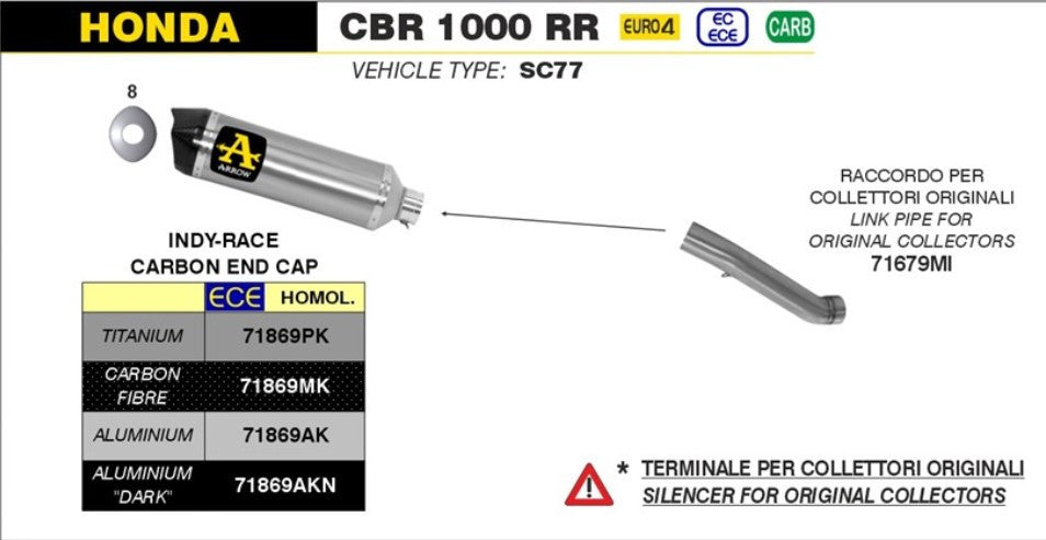 Le Slip-on de la flèche 71869ak était spécifiquement pour le Honda CBR 1000 RR SC77 (Building Years 2017-2019) développé et se compose de haute qualité aluminium. L'échappement pèse 2,73 kg et en assure un Amélioration des performances ainsi qu'un Acceptation optimisée des gaz et un Augmentation notable des performances. Le Db tueur permet le contrôle du volume et le Numéro en e L'approbation des routes garantit. IMPORTANT: ce slip-on ne peut être connecté qu'à la Flèche Intermédiaire tube 71679mi À utiliser et ne pas tenir sur le tube intermédiaire d'origine.