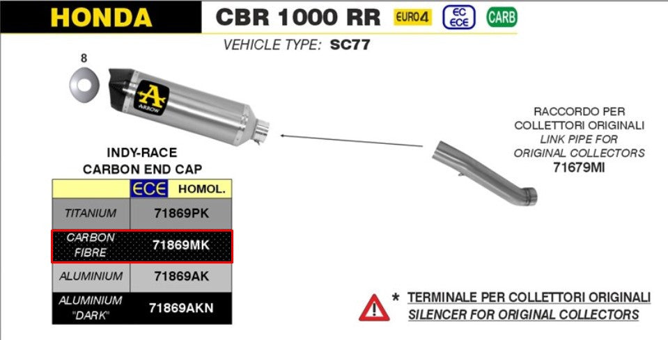 Le Slip-on de la flèche 71869mk était spécifiquement pour le Honda CBR 1000 RR SC77 (Building Years 2017-2019) développé et se compose de haute qualité Carbone. Avec un poids de seulement 2,63 kg ce slip-on en assure un Amélioration des performances ainsi qu'un Acceptation optimisée des gaz et un Augmentation notable des performances. Le Db tueur permet le contrôle du volume et le Numéro en e L'approbation des routes garantit. Ce slip-on ne peut être connecté qu'aux Flèche Intermédiaire tube 71679mi À utiliser et ne pas tenir sur le tube intermédiaire d'origine.