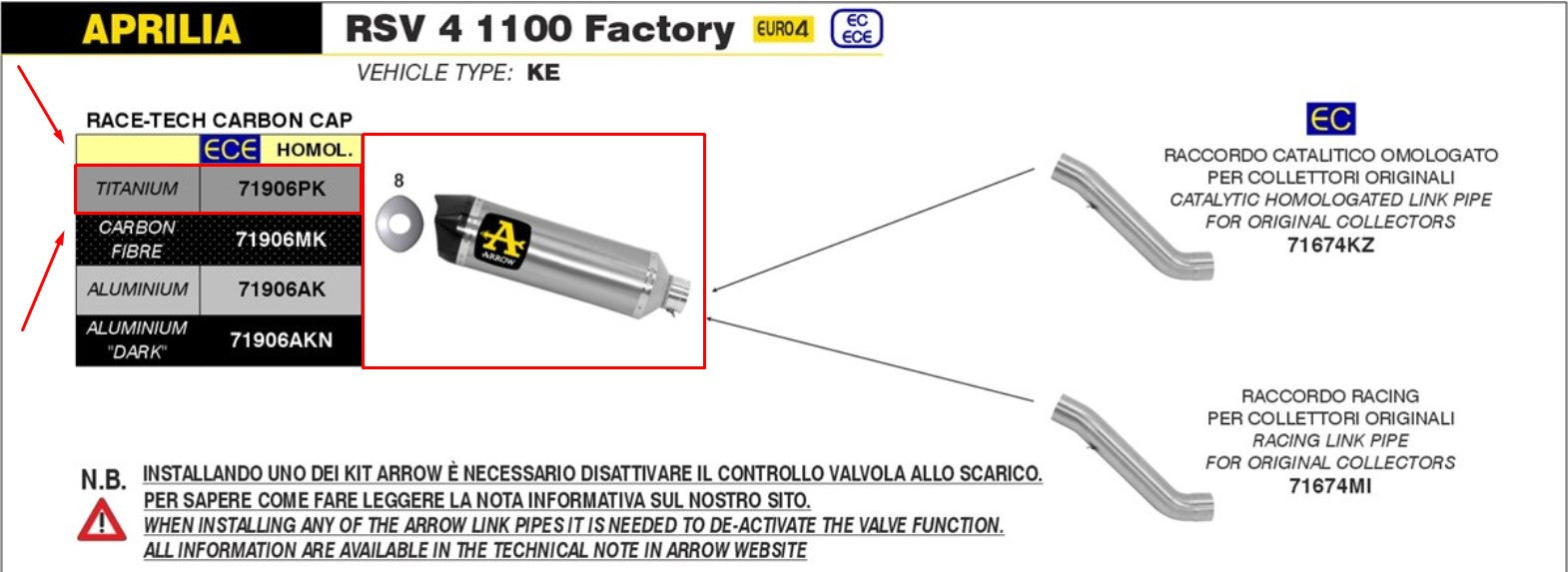 Le Slip-On de Arrow 71906pk de la série Race-Tech a été spécialement développé pour l'usine Aprilia RSV4 1100 (construite en 2019-2020). Avec un silencieux final en titane de haute qualité et un capuchon d'extrémité en carbone, ce slip-on offre une combinaison parfaite de conception de lumière, un look noble et des performances optimisées. Combiné avec un tube intermédiaire flèche, le slip-on peut être étendu à un système complet, ce qui augmente le comportement de performances et de réponse de votre machine à un nouveau niveau.