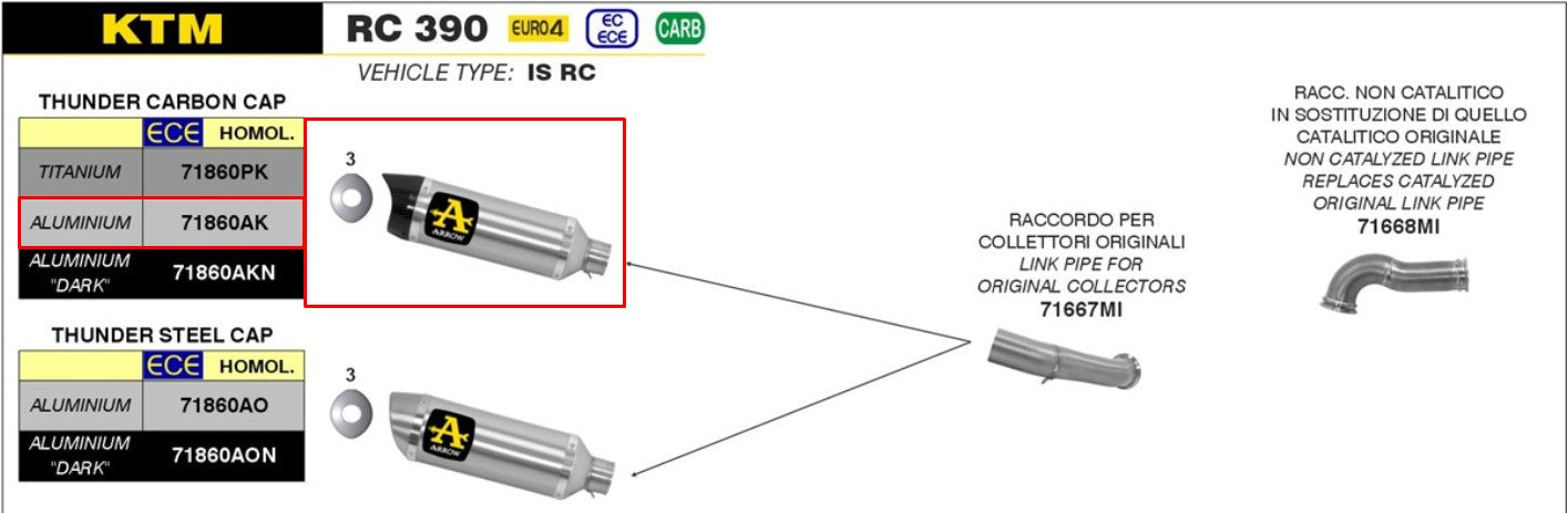 Le Aluminium Thunder Slip-On de flèche 71860ak pour KTM RC 390 (2017-2020) vous offre un Performance - Environ et sportif Les flux de fuite qui améliorent à la fois le comportement de conduite et l'apparence de votre KTM RC 390. Avec le Capes d'extrémité en carbone et que Silencieux de fin d'aluminium Vous obtenez non seulement une excellente performance, mais aussi une solution durable pour votre moto. Commander aujourd'hui et vivre les avantages du Flèche de tonnerre de flèche Pour votre KTM RC 390!