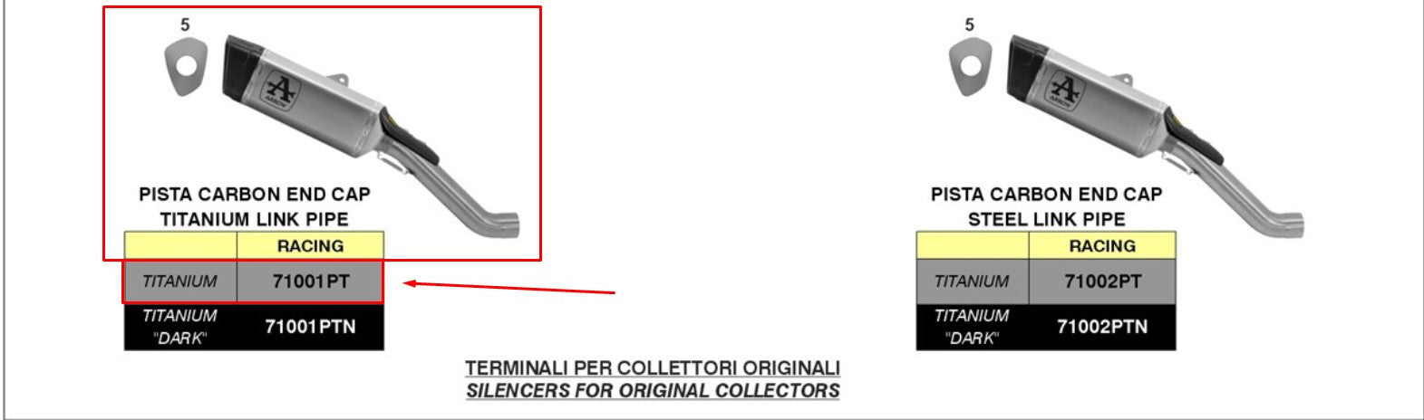 Le Slip-On de Arrow 71001pt de la série Pista a été spécialement développé pour l'usine Aprilia RSV4 1100 (construite en 2019-2020). Ce slip combine une conception sportive, une construction légère et des performances maximales avec un silencieux final en titane de haute qualité et un capuchon d'extrémité en carbone. Avec un poids de seulement 3,00 kg, il est idéal pour une utilisation sur la piste de course.