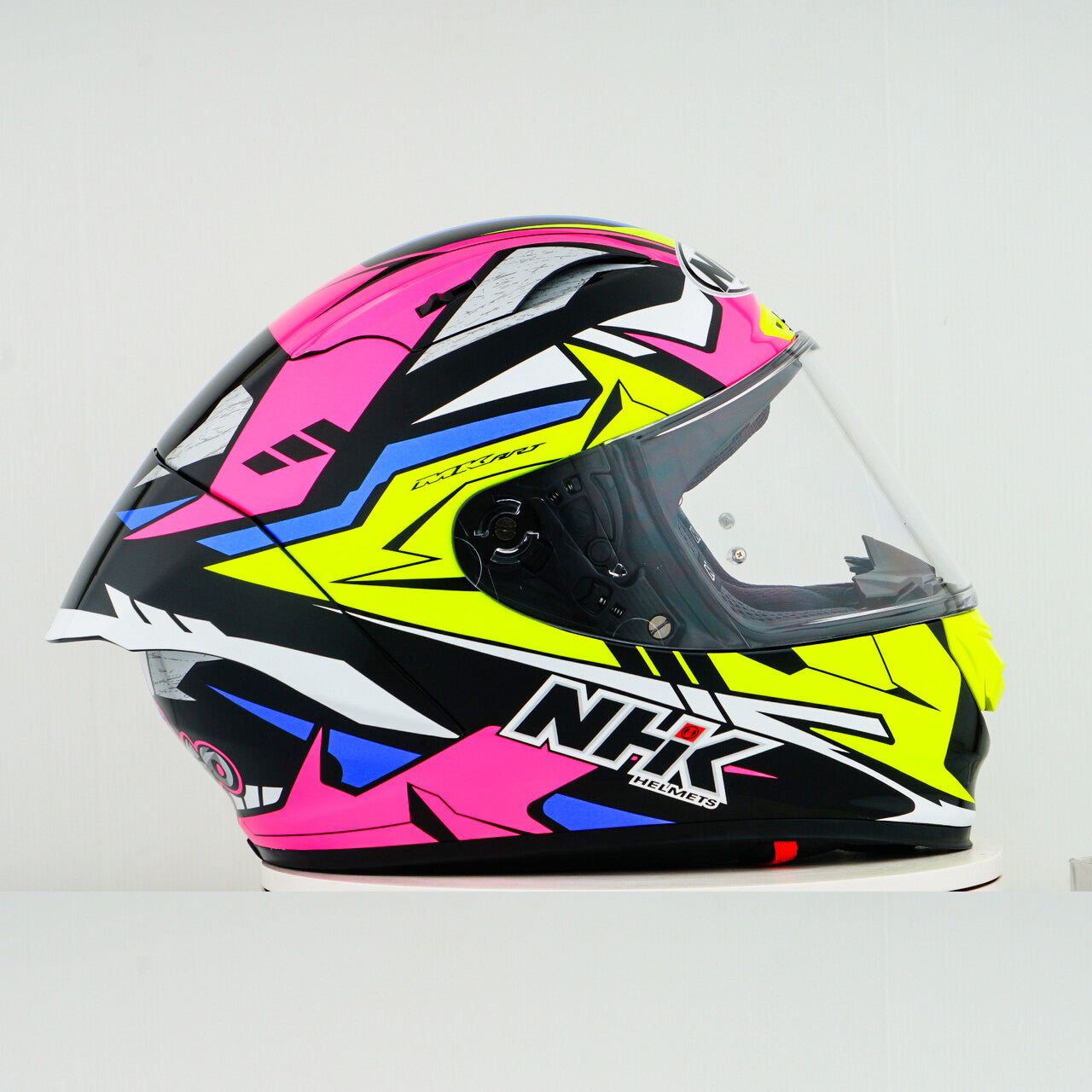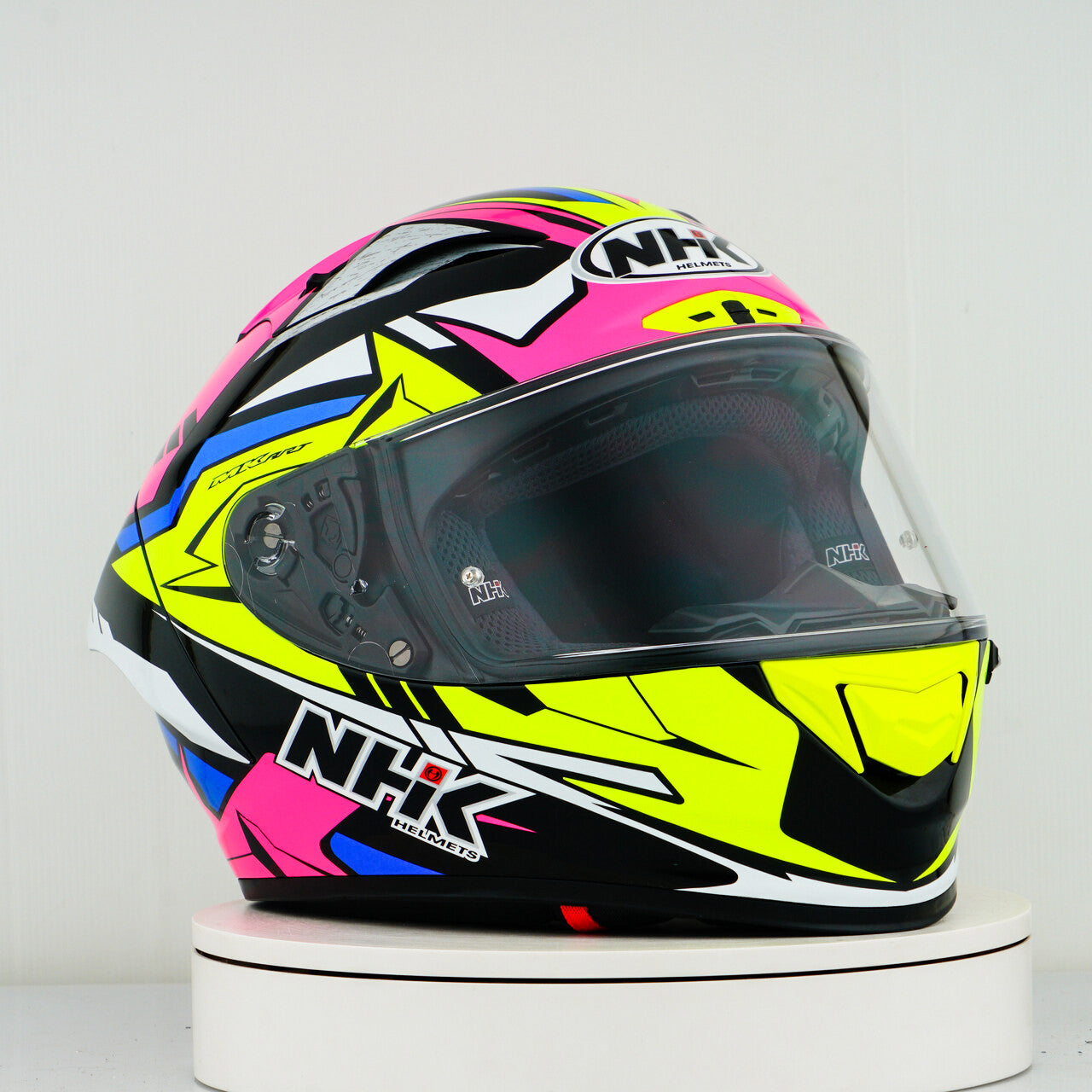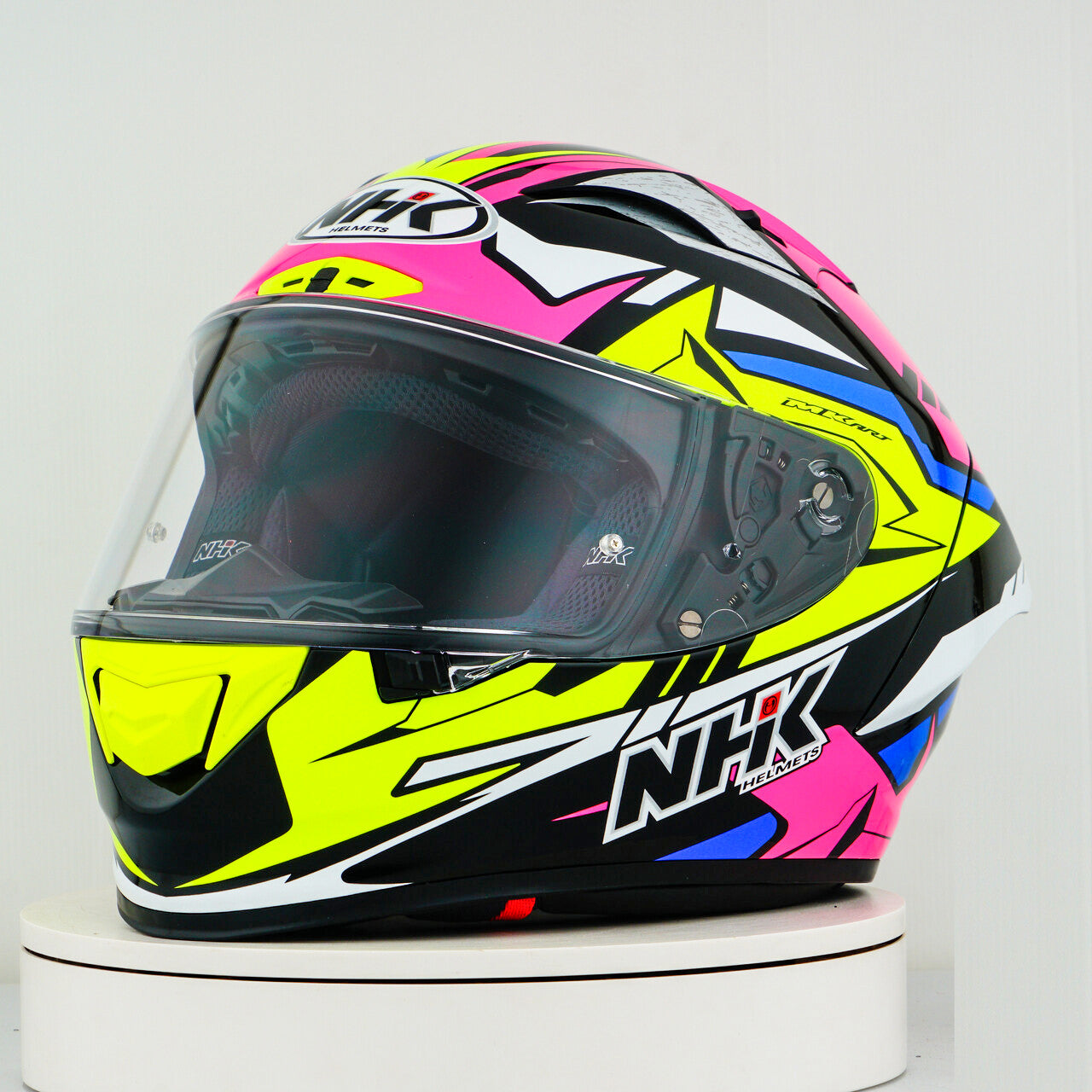 Découvrez le casque de moto ultime avec la course technologique NHK GP-R, qui est FIM et un composite renforcé en fibre de verre avancé (AFRC) en cinq tailles qui garantit un ajustement et une protection parfaits. L'AFRC est un matériau composite qui se compose d'une matrice et de fibres de renforcement. La matrice est généralement un polymère (par exemple la résine époxy), tandis que les fibres de renforcement sont faites de fibres de verre. Avec neuf tailles de coque intérieure et douze tailles de casque, vous trouverez toujours l'ajustement idéal. Notre système de ventilation en air 4D assure une ventilation optimale et un ajustement confortable, tandis que la doublure intérieure de qualité supérieure et confortable offre un confort maximum. Le casque a été testé aérodynamiquement testé dans les classes MotoGP et a une visière plate avec "vue grand angle" pour un champ de vision étendu. La visière de la broche et de la déchirure garantit une vue claire de toutes les conditions. Grâce au système de visière mécanique 100% complet, le changement de la visière est facile et rapide. La doublure intérieure amovible et lavable assure des soins et une hygiène faciles. Le casque est également préparé pour un "sac de chameau" et peut facilement être transporté avec des lunettes. Le système de rétention à double anneau et la joue pour acceptation offrent une sécurité et une stabilité supplémentaires. Le casque a été testé dans la soufflerie pour assurer les meilleures performances à grande vitesse.