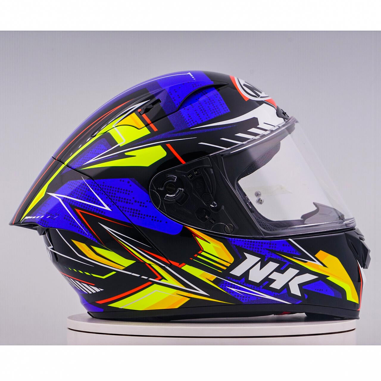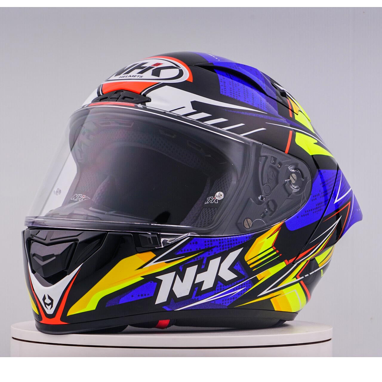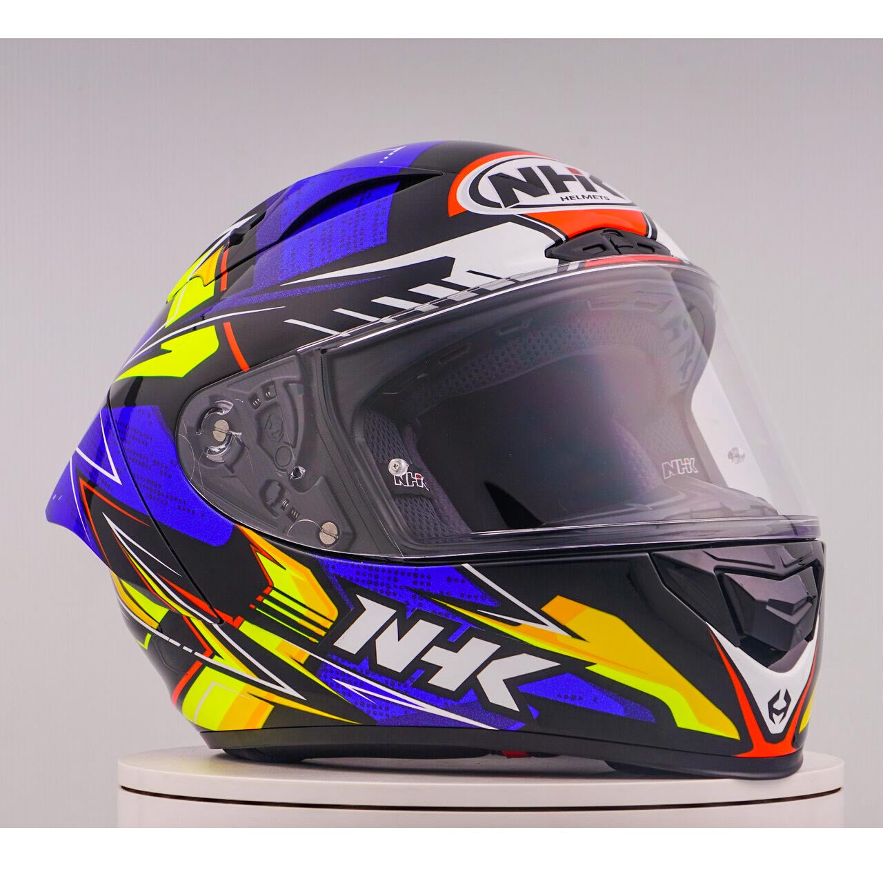 Découvrez le casque de moto ultime avec la course technologique NHK GP-R, qui est FIM et une coque composite composite renforcée en fibre de verre avancée (AFRC) en cinq tailles qui garantit un ajustement et une protection parfaits. L'AFRC est un matériau composite qui se compose d'une matrice et de fibres de renforcement. La matrice est généralement un polymère (par exemple la résine époxy), tandis que les fibres de renforcement sont faites de fibres de verre. Avec neuf tailles de coque intérieure et douze tailles de casque, vous trouverez toujours l'ajustement idéal. Notre système de ventilation en air 4D assure une ventilation optimale et un ajustement confortable, tandis que la doublure intérieure de qualité supérieure et confortable offre un confort maximum. Le casque a été testé aérodynamiquement testé dans les classes MotoGP et a une visière plate avec "vue grand angle" pour un champ de vision étendu. La visière de la broche et de la déchirure garantit une vue claire de toutes les conditions. Grâce au système de visière mécanique 100% complet, le changement de la visière est facile et rapide. La doublure intérieure amovible et lavable assure des soins et une hygiène faciles. Le casque est également préparé pour un "sac de chameau" et peut facilement être transporté avec des lunettes. Le système de rétention à double anneau et la joue pour acceptation offrent une sécurité et une stabilité supplémentaires. Le casque a été testé dans la soufflerie pour assurer les meilleures performances à grande vitesse.